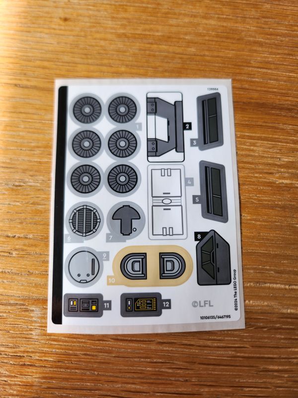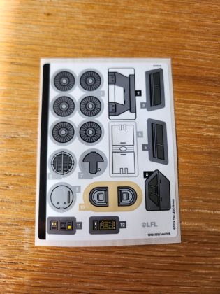 Schon beim ersten Blick auf die Verpackung fällt auf, dass LEGO hier Wert auf eine hochwertige Präsentation gelegt hat. Die Vorderseite zeigt die Onyx Cinder in einer imposanten Flugpose vor galaktischem Hintergrund, eingerahmt von einem Serien-Design passend zu Skeleton Crew. Auf der Rückseite sind die zahlreichen Spielfunktionen und Innenräume hervorgehoben, was bereits Lust aufs Bauen macht. Im Inneren der Schachtel warten 13 nummerierte Tüten sowie ein separater Kartonumschlag für Anleitung und Stickerbogen, eine willkommene Neuerung, die sicherstellt, dass nichts verknickt oder beschädigt ankommt. Der Stickerbogen ist überschaubar, aber einige runde Aufkleber verlangen beim Anbringen Präzision.