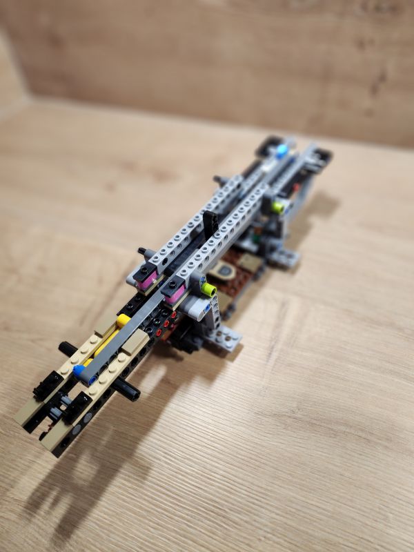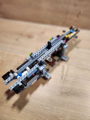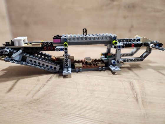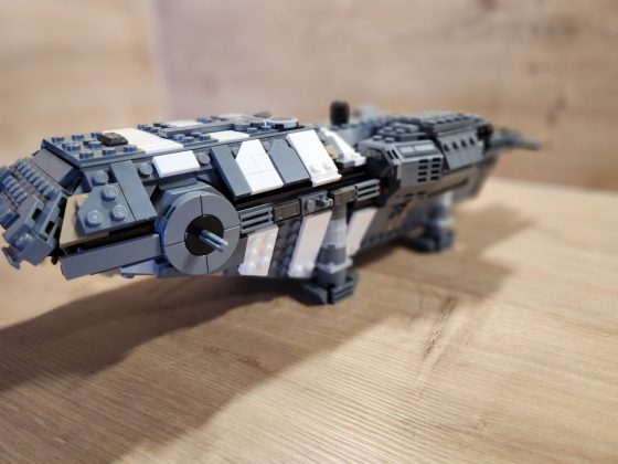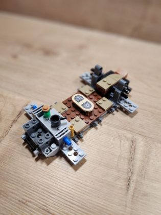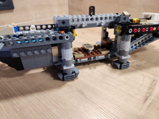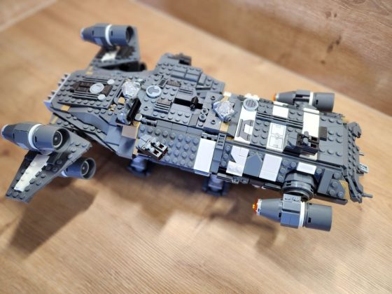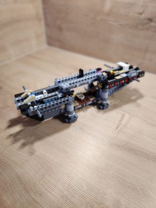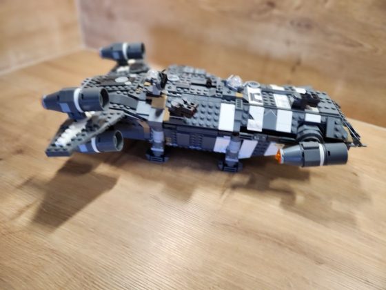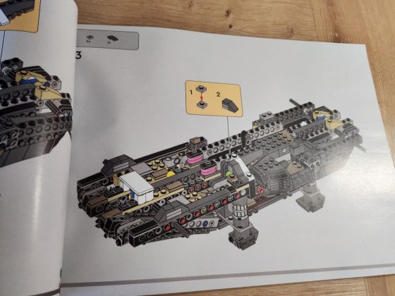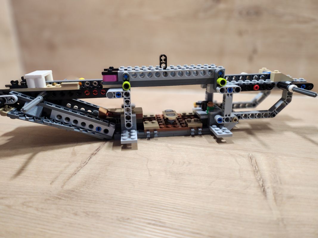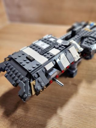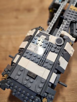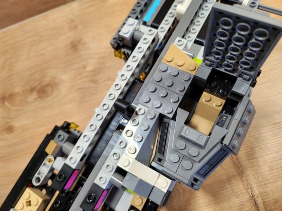 Der Aufbau der Onyx Cinder verteilt sich über 13 Bauabschnitte und erweist sich als durchweg abwechslungsreich. Schon früh werden die Technic-Elemente im Inneren integriert, die später die synchronisierte Bewegung der Triebwerke ermöglichen. Dadurch wirkt der Bau von Anfang an technisch interessant. Im mittleren Teil dominieren klassische Platten- und Paneelstrukturen, die mit zahlreichen Winkeln und SNOT-Techniken verbunden werden. Besonders die Frontsektion mit ihrer asymmetrischen Form verlangt etwas Geduld, belohnt aber mit einem stabilen und detailreichen Ergebnis. Die Innenräume werden parallel zur äußeren Hülle gestaltet, sodass man immer wieder kleine Highlights wie den Tisch oder das Bett entdeckt. Trotz der blockigen Gesamtform kommt keine Monotonie auf, da regelmäßig Mechanik, Details und Paneele im Wechsel gebaut werden. Alles in allem ist der Bauprozess ausgewogen und macht sowohl für erfahrene Fans als auch für Einsteiger Freude.