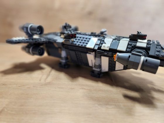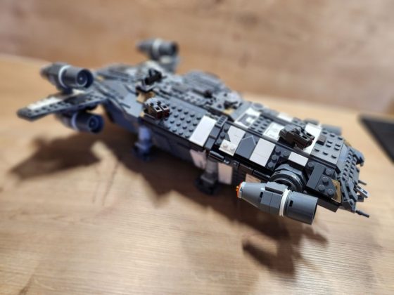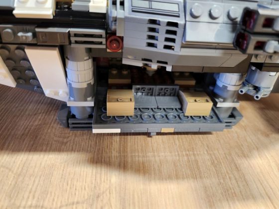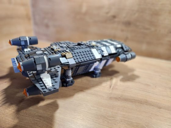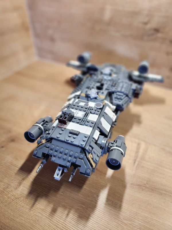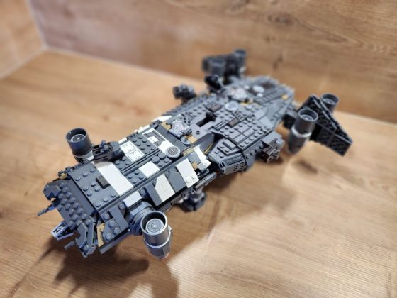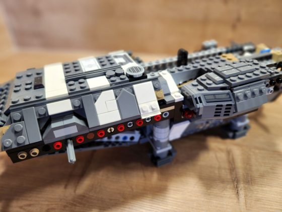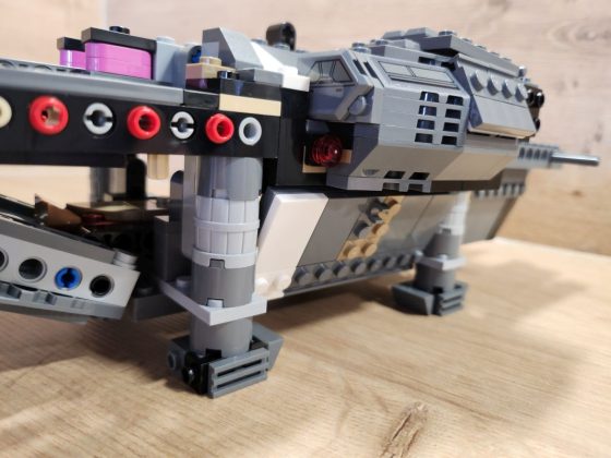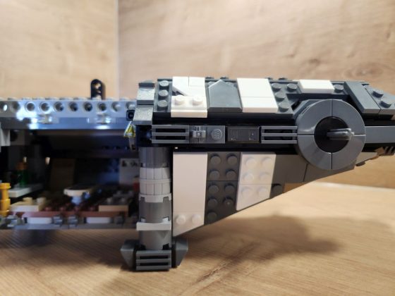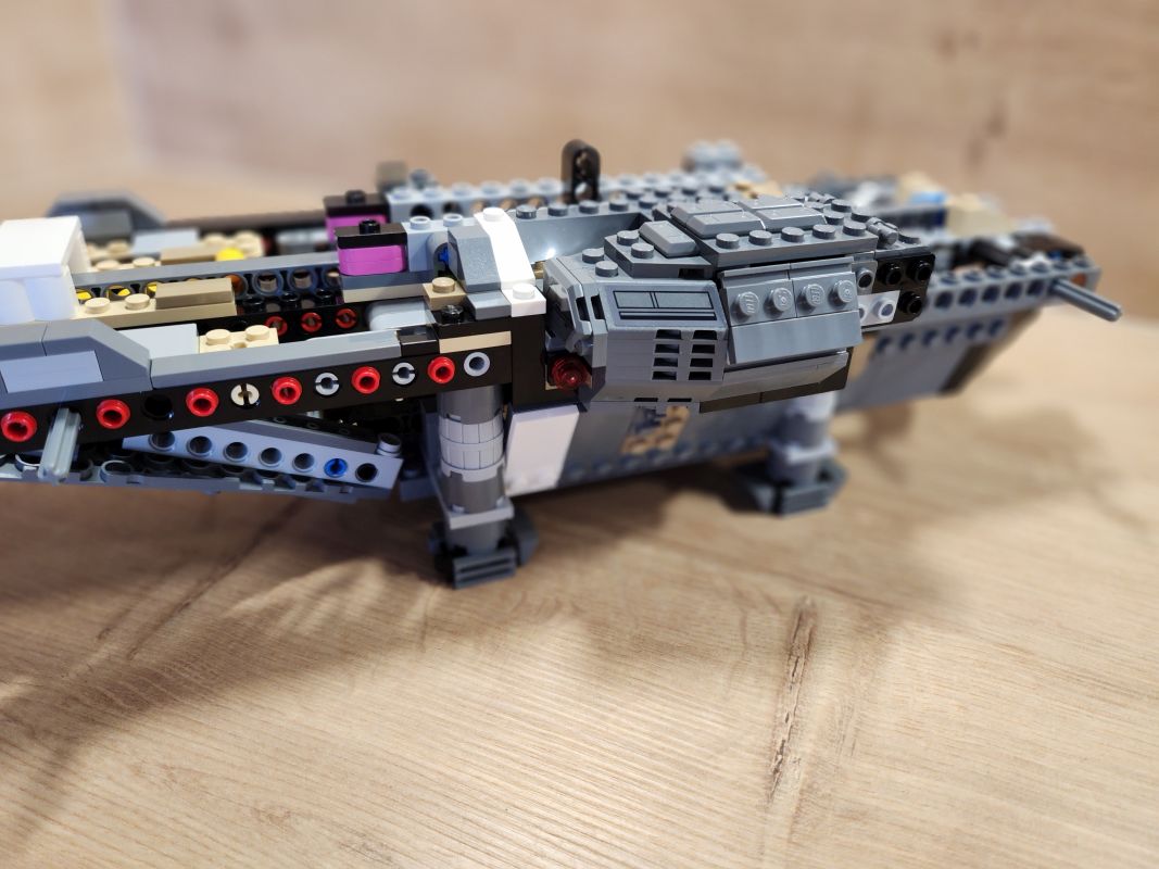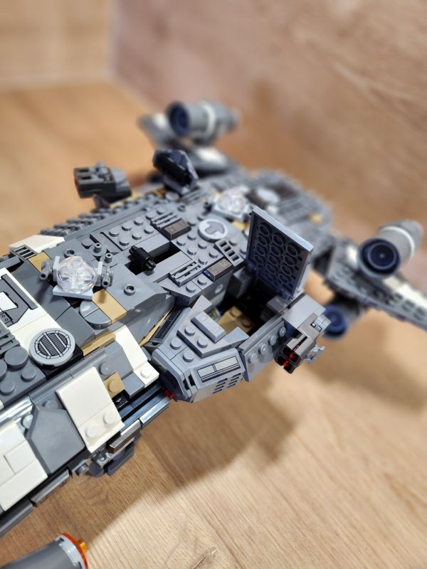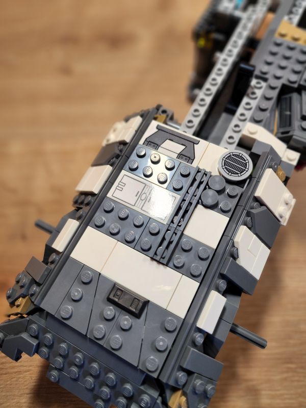 Mit einer Länge von 36 Zentimetern ist die Onyx Cinder ein wuchtiges Schiff, das sofort auffällt. Doch statt eleganter Linien setzt das Design auf kantige, klobige Formen. Für einen Frachter ist das stimmig, optisch polarisiert es aber sicherlich. Die Onyx Cinder steht auf vier robusten Landestützen, die zwar nicht einziehbar sind, aber Stabilität garantieren. Besonders beeindruckend ist die Technic-Mechanik: Über einen Hebel lassen sich die sechs Triebwerke synchron um 90 Grad drehen, was den Wechsel zwischen Flug- und Landemodus überzeugend simuliert. Die Oberflächen sind reichlich mit Details versehen, Greebling, Kanonen, Sensoren und eine asymmetrische Cockpit-Sektion vermitteln das Gefühl eines funktionalen, industriellen Arbeitsschiffs. Die Farbpalette bleibt überwiegend grau, was zum Frachter-Design passt, aber in der Star Wars-Landschaft nichts Neues darstellt.