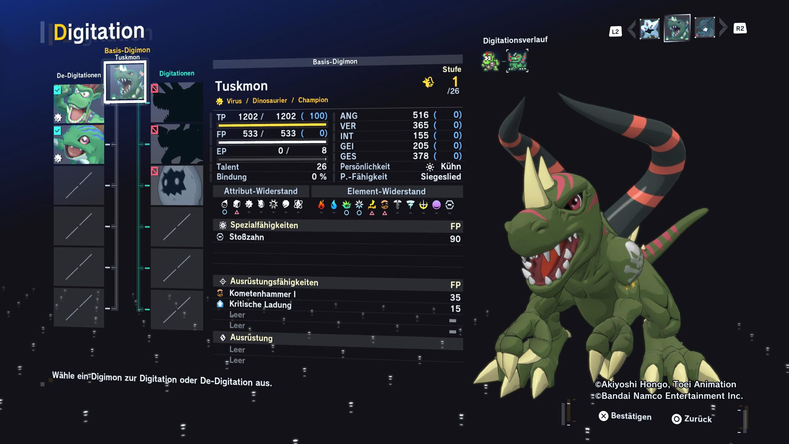 Das Herzstück bleibt das Digivolutions-System: Jedes Digimon besitzt mehrere Entwicklungswege, die sich durch Statuswerte, Items und Training beeinflussen lassen. So entsteht ein komplexes Netz an Möglichkeiten, das Fans stundenlang fesseln kann. Leider wird dieser Aspekt durch lineares Leveldesign eingeschränkt, Dungeons sind kurz, Gegner spawnen nur durch Backtracking neu, und Grinding ist kaum möglich. Eine prozedural generierte Zone hätte hier die perfekte Lösung geboten.