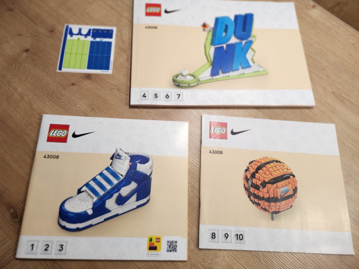 Der Bauprozess des LEGO Nike Dunk ist in drei klar abgegrenzte Abschnitte unterteilt: den Sneaker selbst, die „DUNK“-Displaybasis und den Basketball. Jede Bauphase wird durch ein eigenes Anleitungsheft begleitet, perfekt, um den Bau mit Freunden oder der Familie zu teilen. Besonders positiv fällt auf, dass LEGO bei diesem Set viele Drucke statt Aufkleber verwendet hat. Nur einige Details wie die Schnürlöcher und seitlichen „Wings“ sind als Sticker umgesetzt. Der Großteil der Logos und grafischen Elemente ist sauber bedruckt, ein Qualitätsmerkmal, das man sonst meist teureren Sets vorbehalten sieht.