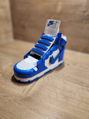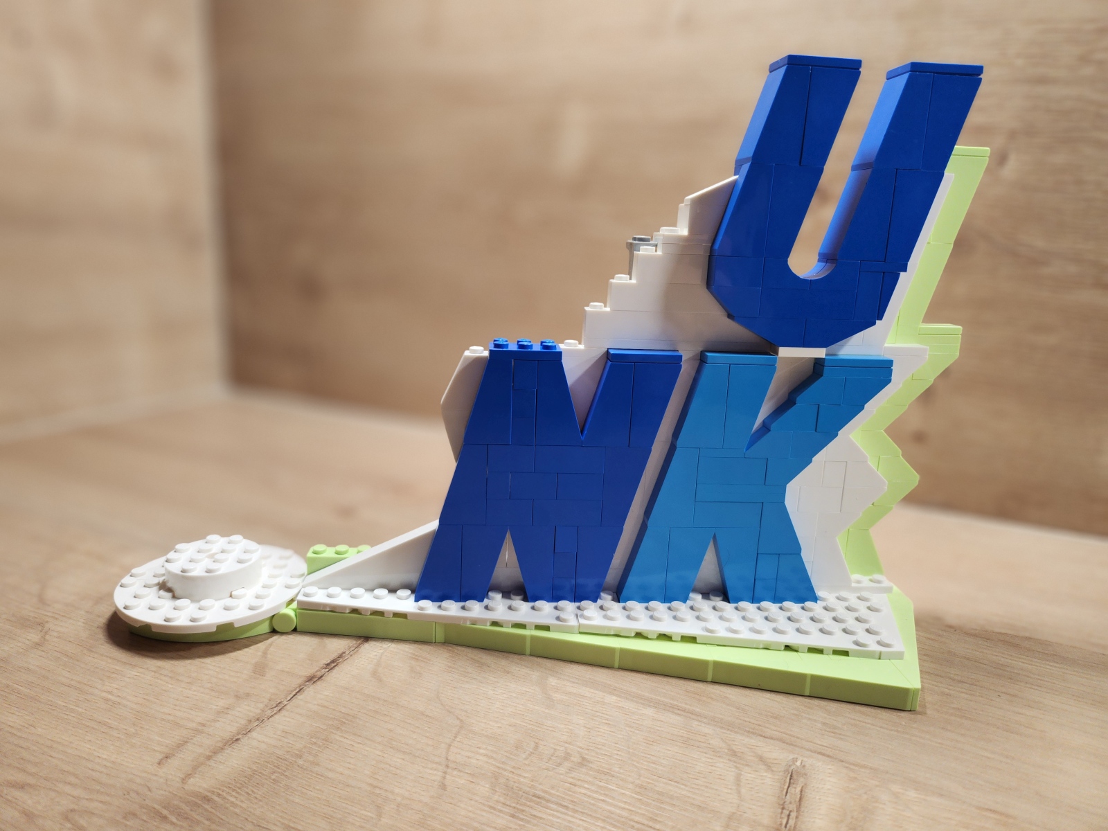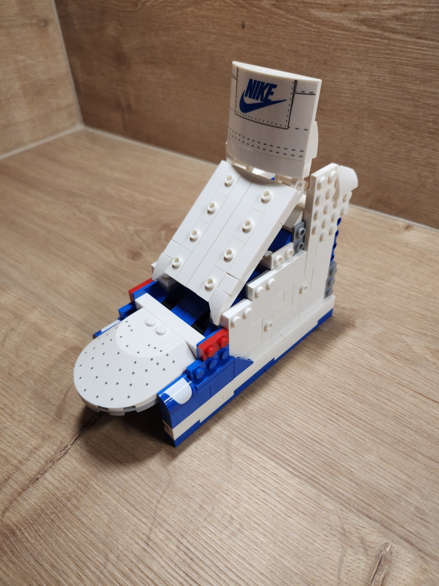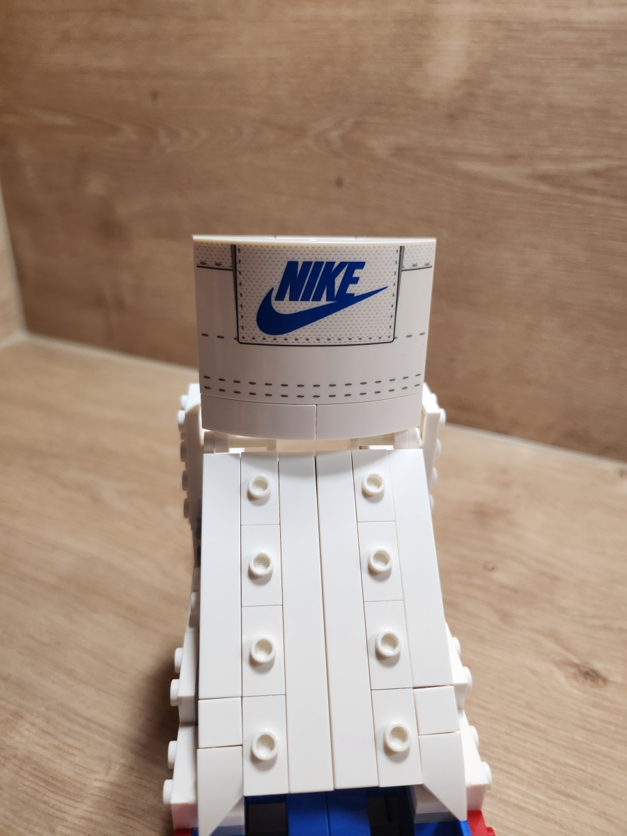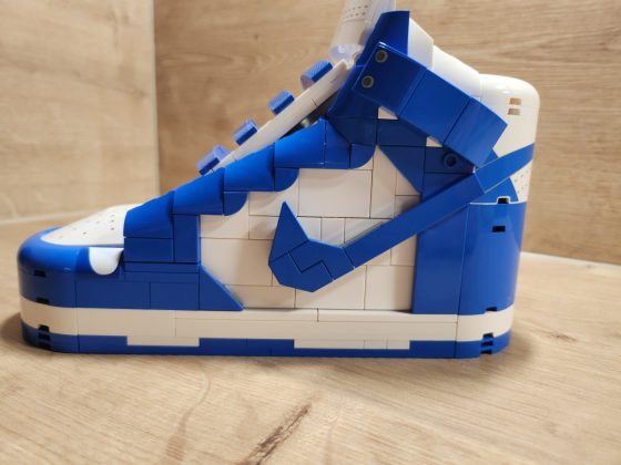 Das fertige Modell überzeugt durch sein sportlich-dynamisches Erscheinungsbild. Die LEGO Nike Dunk wurde in der Farbvariante „Game Royal“ umgesetzt, ein ikonisches Blau-Weiß, das perfekt zu Nikes Basketball-Heritage passt. Die Silhouette ist erstaunlich realistisch geraten: Von der charakteristischen Zehenbox über die geschwungene Swoosh-Linie bis hin zum stabilen High-Top-Design stimmt hier fast alles. Besonders der Zehenbereich mit den bedruckten Belüftungspunkten sticht hervor, ebenso wie die bedruckte Zunge mit LEGO- und Nike-Logo.