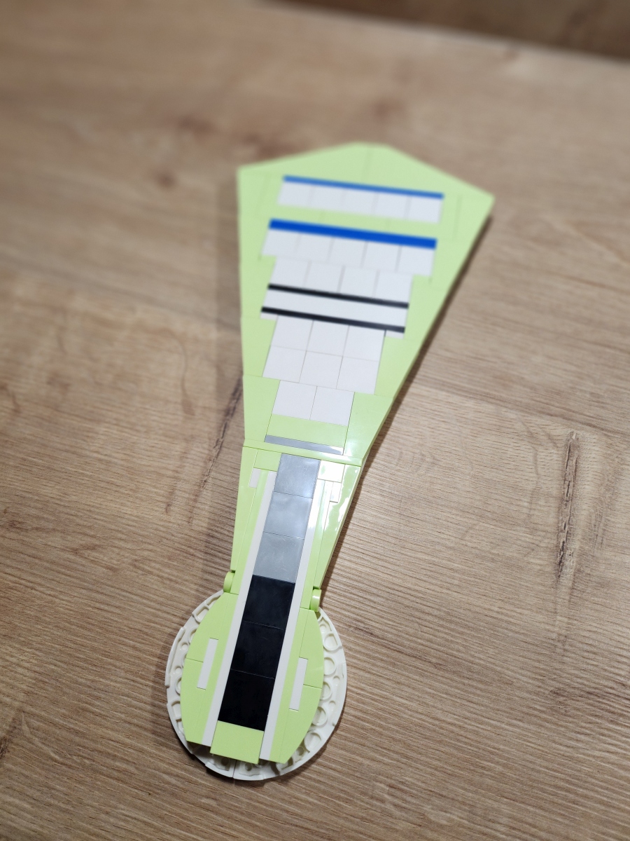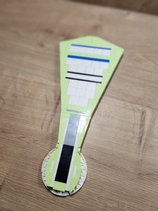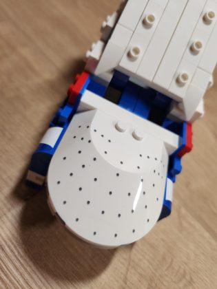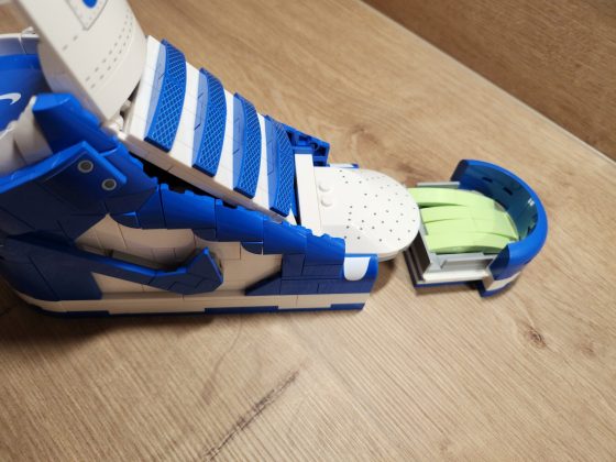 Ein kleines Highlight ist der integrierte Stauraum im Schuh: Das vordere Segment lässt sich herausziehen und bietet Platz für alternative Schnürsenkel oder kleine Gegenstände. Der Fersenbereich verfügt ebenfalls über ein Fach – sogar die Minifigur kann darin verstaut werden. Diese kleinen Extras verleihen dem Modell einen praktischen, fast spielerischen Charakter. Die Sohle zeigt erwartungsgemäß LEGO-Strukturen mit Noppen und Röhren, bleibt aber dem Look eines echten Sneakers erstaunlich treu. Einziger Kritikpunkt: Der Farbton einiger Sticker passt nicht ganz perfekt zum Weiß der gedruckten Elemente – ein kleiner, aber sichtbarer Bruch in der Optik.