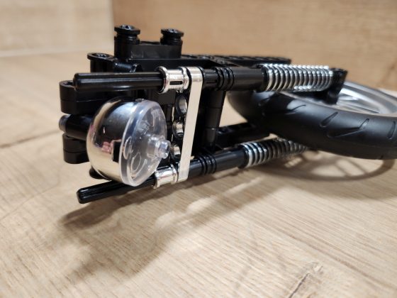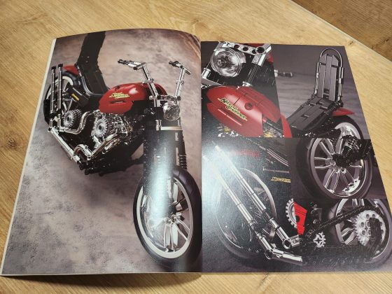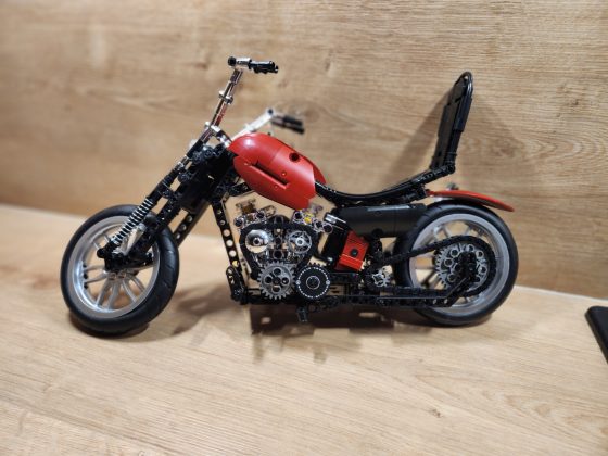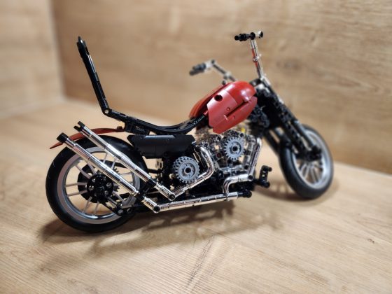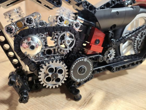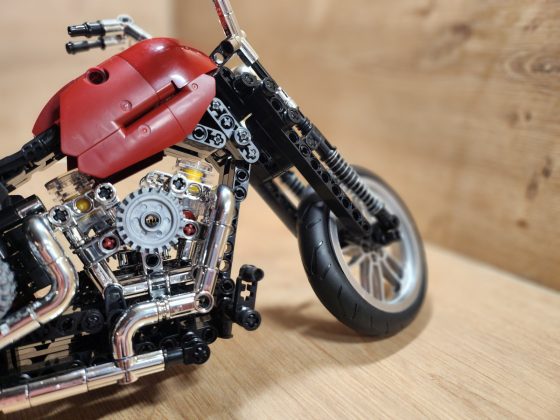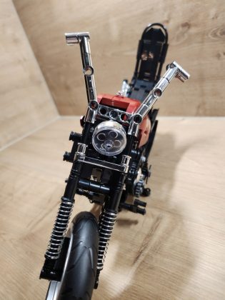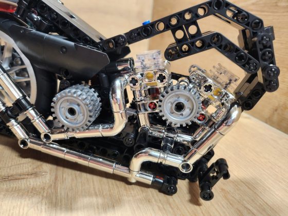 Der Aufbau des Choppers ist eine Reise durch klassische Motorradmechanik in Klemmsteinform. Nifeliz hat die Schritte klug aufgeteilt: Zunächst entsteht der robuste Mittelrahmen mit Motor, Getriebe und Antriebskette, danach folgen Lenker, Sitzbank und die eleganten Kotflügel. Eine echte Stärke des Sets ist das bewegliche Innenleben. Der V2-Motor besitzt funktionierende Kolben, die sich mitdrehen, sobald das Hinterrad bewegt wird. Auch die Antriebskette läuft mit, ein wunderbares, realistisches Detail, das die Mechanik greifbar macht. Die Lenkung funktioniert sauber, der Gabelwinkel ist schön flach und vermittelt das typische Chopper-Gefühl. Besonders positiv: Die Bauanleitung ist klar und übersichtlich, mit wenig Verwechslungsgefahr bei kleinen Technic-Pins. Die geschätzte Bauzeit liegt bei etwa 2 bis 3 Stunden, je nach Erfahrung.