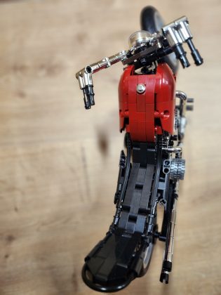 Optisch ist der Nifeliz Chopper ein echter Hingucker. Die Mischung aus glänzenden Chromteilen, mattschwarzem Rahmen und roten Akzenten sorgt für eine sehr authentische Custom-Optik. Der lange Radstand, die tief liegende Sitzbank und der leicht hochgezogene Lenker treffen genau den Stil klassischer US-Chopper. Die Detailverliebtheit zeigt sich in vielen kleinen Elementen: Bremsleitungen, Fußrasten, Kettenführung und die stilisierte Tankform wurden sorgfältig umgesetzt. Auch die Verkleidung am Heck und die offene Motorkonstruktion verleihen dem Modell eine beeindruckende Präsenz. Einziger kleiner Kritikpunkt: Manche Teile müssen schon mit etwas mehr Gewalt hineingedrückt werden und erfordern dabei etwas Geschick. Kein wirkliches Drama, man sollte aber schon einmal ein ähnliches Set vorher gebaut haben.