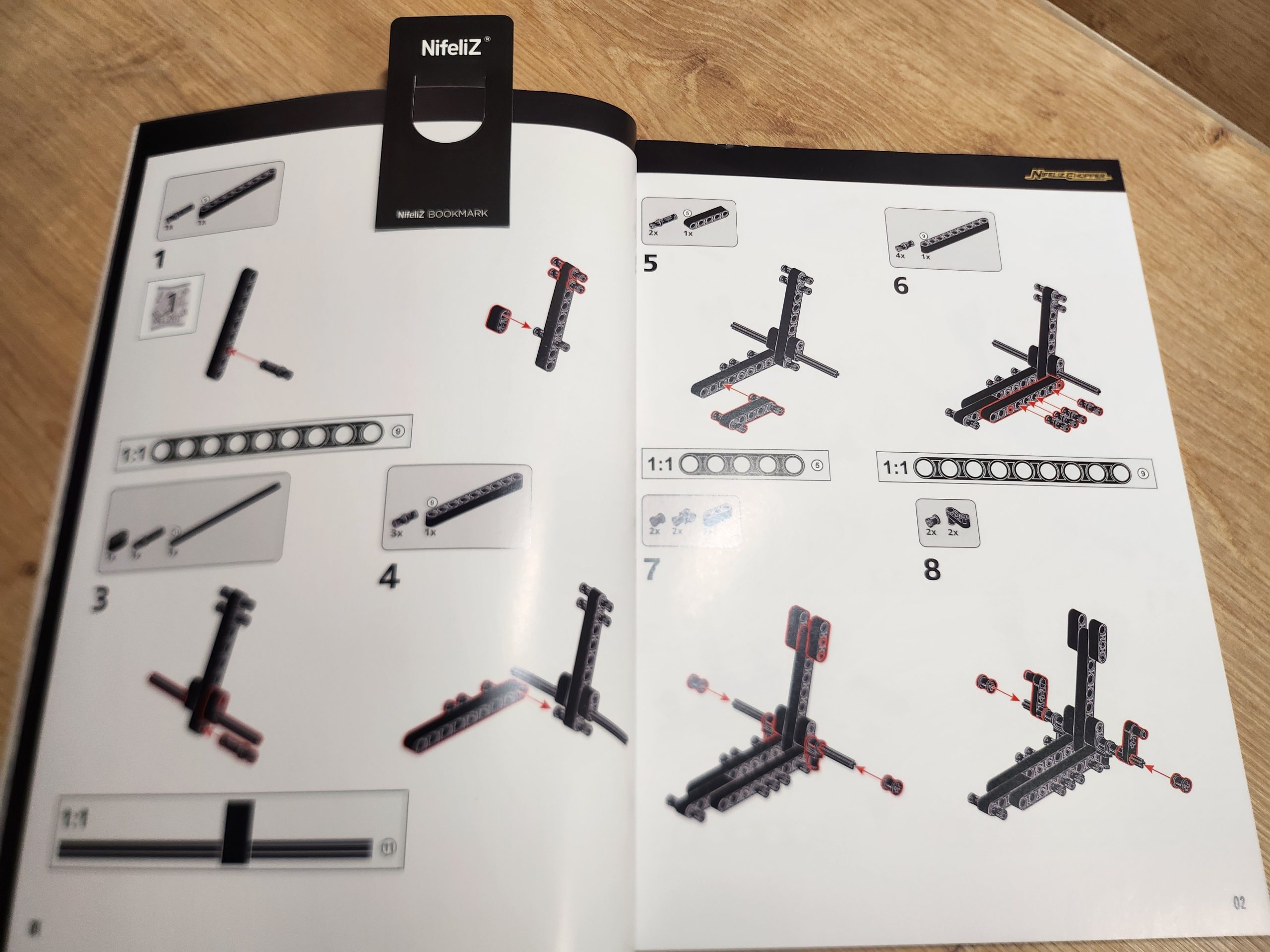 Schon beim ersten Blick auf die Verpackung fällt auf: Nifeliz hat hier kein Kinderspielzeug im Sinn, sondern ein Sammlermodell. Das schlichte schwarze Design mit glänzendem Produktfoto wirkt hochwertig und erinnert an Präsentationsboxen aus der Automodell-Branche. Im Inneren finden sich mehrere nummerierte Beutel, eine gebundene Bauanleitung in Farbe und einzelne verpackte Chromteile. Besonders schön: Das Set ist sauber sortiert, wodurch das Bauen strukturiert und angenehm verläuft. Bereits der Aufbau der Basis, Rahmen, Schwinge und Motorblock, vermittelt echtes Technik-Feeling.