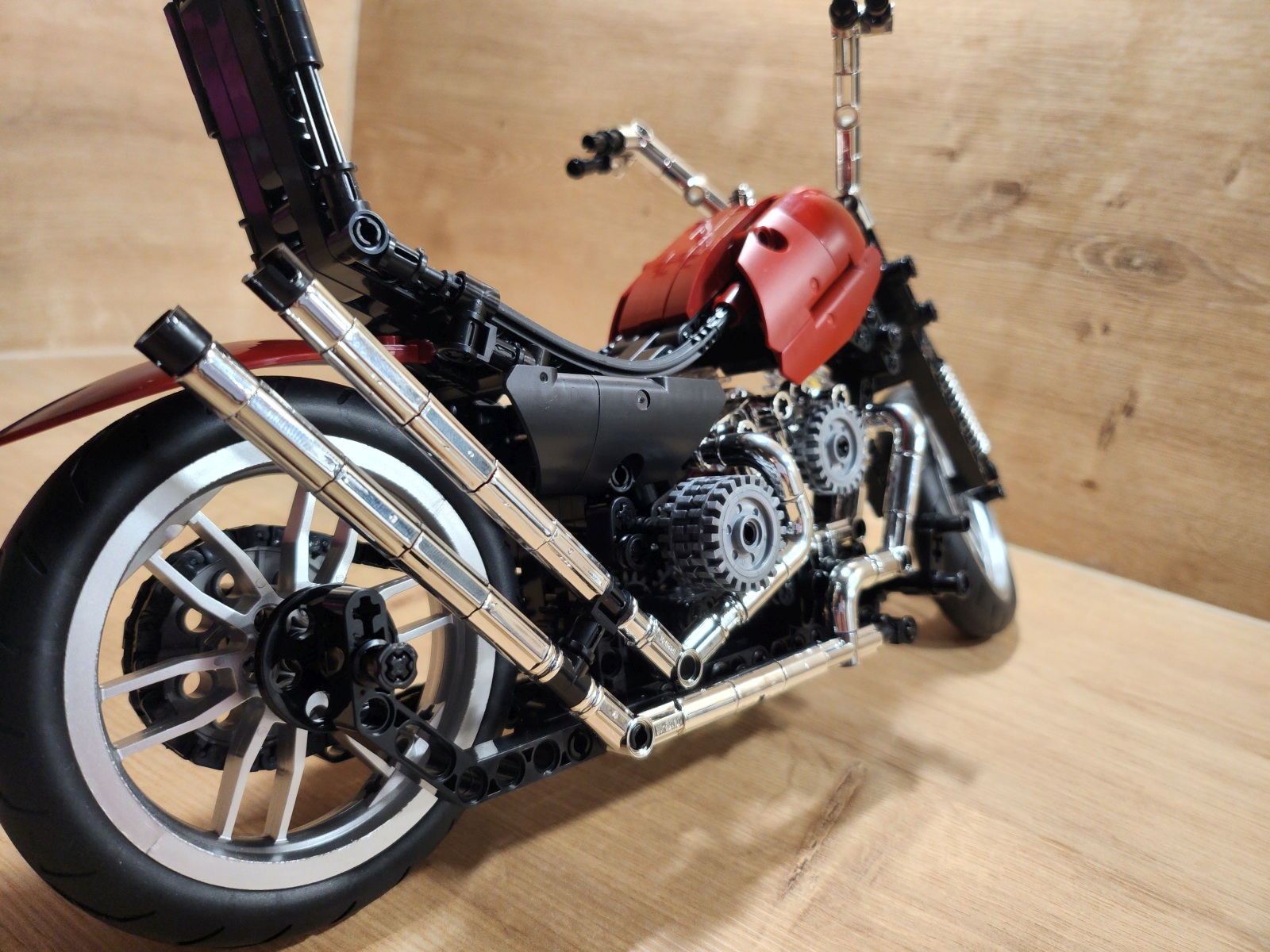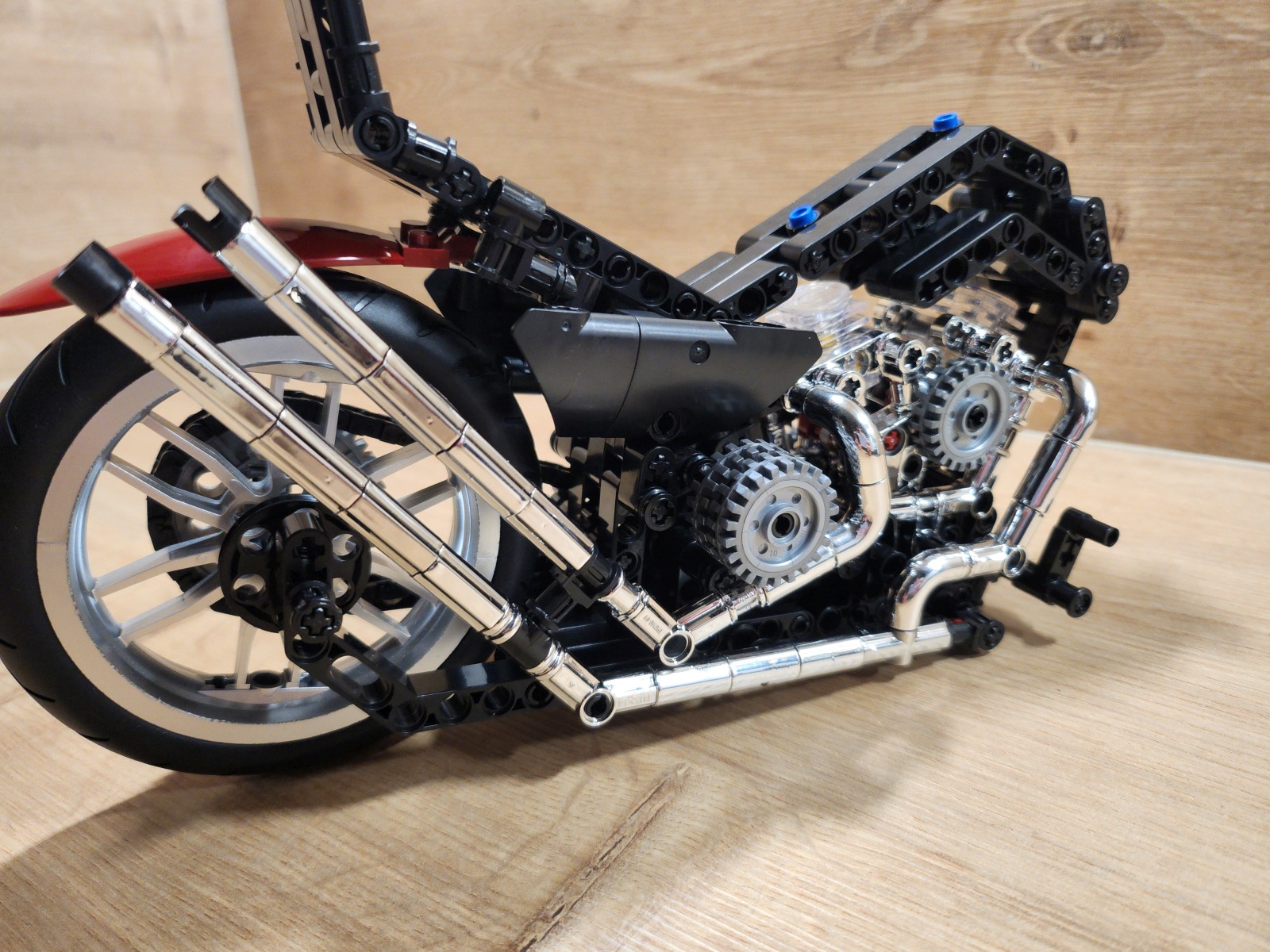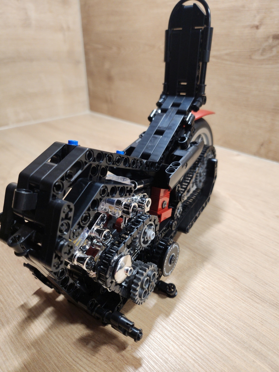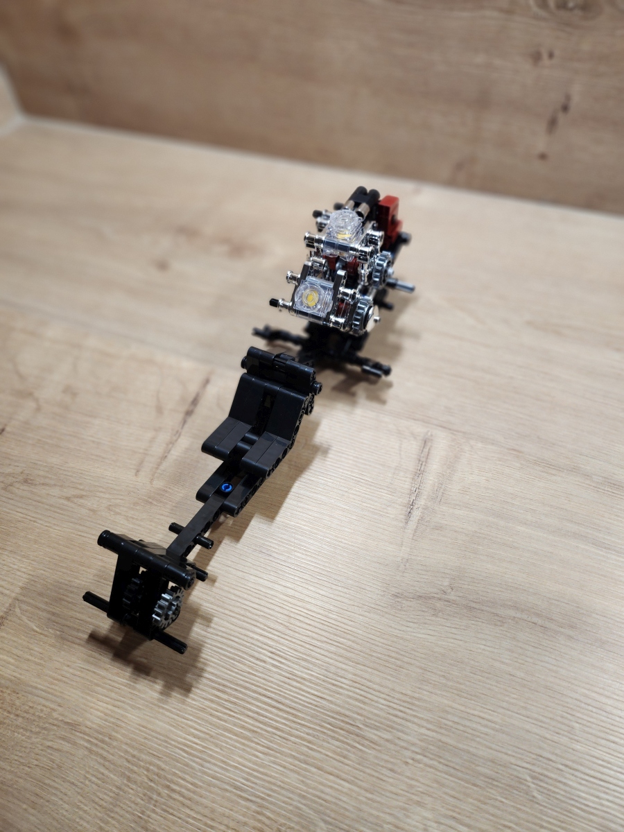 Der Aufbau des Choppers ist eine Reise durch klassische Motorradmechanik in Klemmsteinform. Nifeliz hat die Schritte klug aufgeteilt: Zunächst entsteht der robuste Mittelrahmen mit Motor, Getriebe und Antriebskette, danach folgen Lenker, Sitzbank und die eleganten Kotflügel. Eine echte Stärke des Sets ist das bewegliche Innenleben. Der V2-Motor besitzt funktionierende Kolben, die sich mitdrehen, sobald das Hinterrad bewegt wird. Auch die Antriebskette läuft mit, ein wunderbares, realistisches Detail, das die Mechanik greifbar macht. Die Lenkung funktioniert sauber, der Gabelwinkel ist schön flach und vermittelt das typische Chopper-Gefühl. Besonders positiv: Die Bauanleitung ist klar und übersichtlich, mit wenig Verwechslungsgefahr bei kleinen Technic-Pins. Die geschätzte Bauzeit liegt bei etwa 2 bis 3 Stunden, je nach Erfahrung.