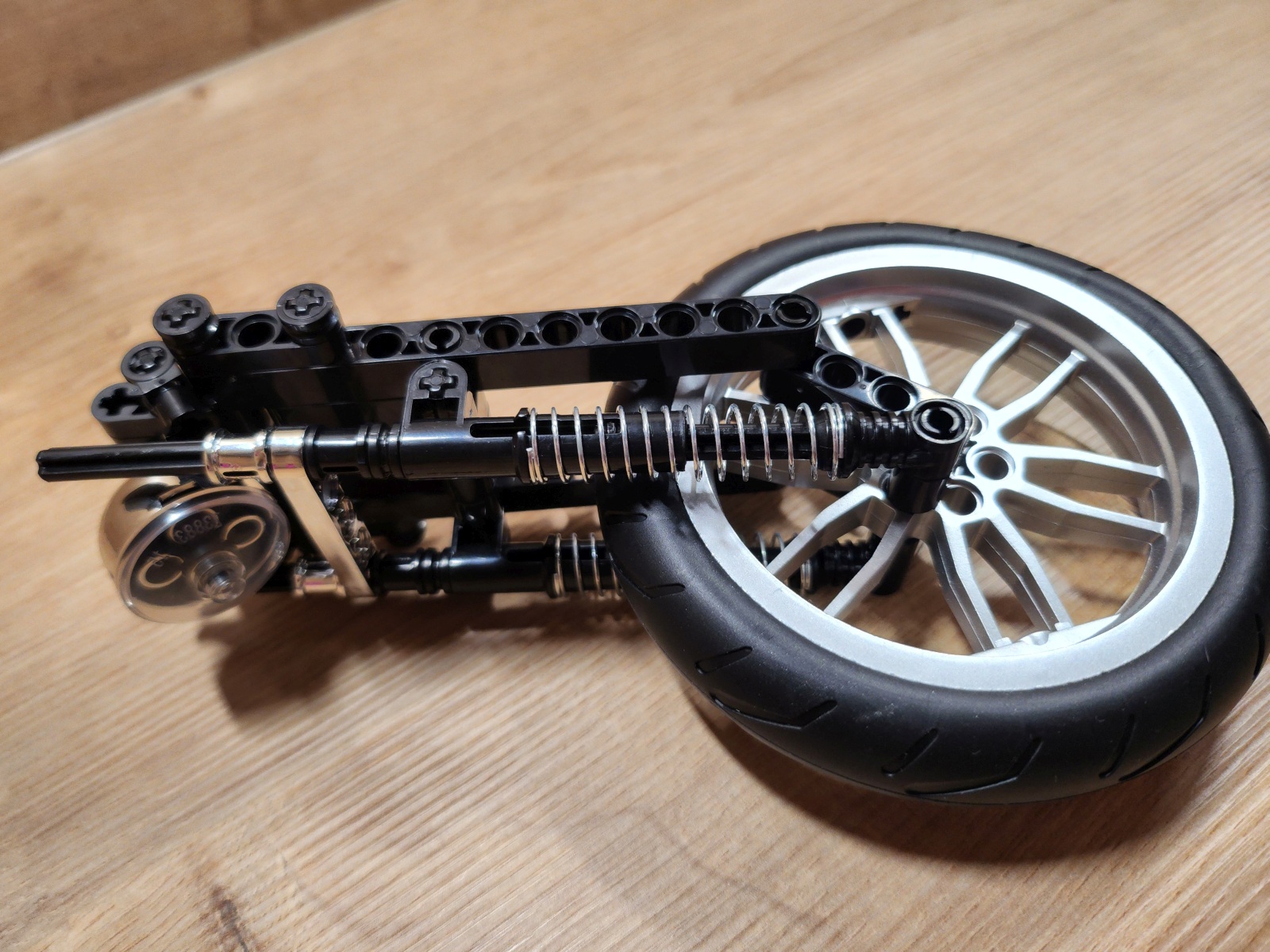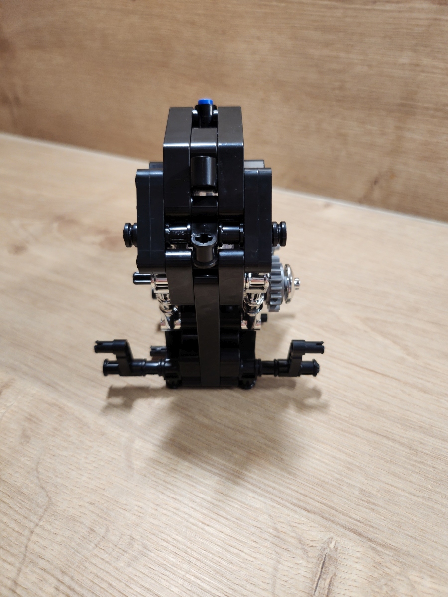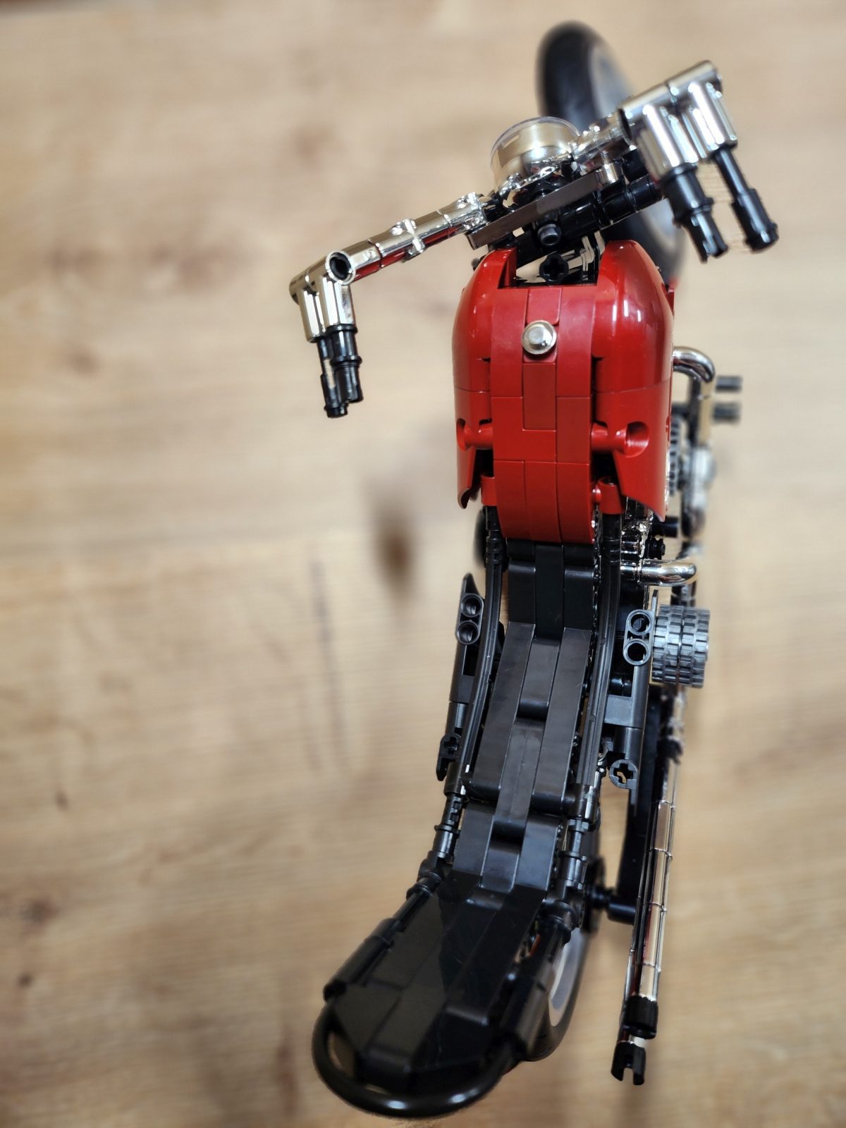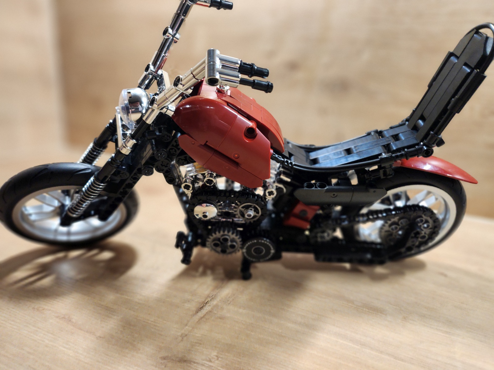Der Aufbau des Choppers ist eine Reise durch klassische Motorradmechanik in Klemmsteinform. Nifeliz hat die Schritte klug aufgeteilt: Zunächst entsteht der robuste Mittelrahmen mit Motor, Getriebe und Antriebskette, danach folgen Lenker, Sitzbank und die eleganten Kotflügel. Eine echte Stärke des Sets ist das bewegliche Innenleben. Der V2-Motor besitzt funktionierende Kolben, die sich mitdrehen, sobald das Hinterrad bewegt wird. Auch die Antriebskette läuft mit, ein wunderbares, realistisches Detail, das die Mechanik greifbar macht. Die Lenkung funktioniert sauber, der Gabelwinkel ist schön flach und vermittelt das typische Chopper-Gefühl. Besonders positiv: Die Bauanleitung ist klar und übersichtlich, mit wenig Verwechslungsgefahr bei kleinen Technic-Pins. Die geschätzte Bauzeit liegt bei etwa 2 bis 3 Stunden, je nach Erfahrung.