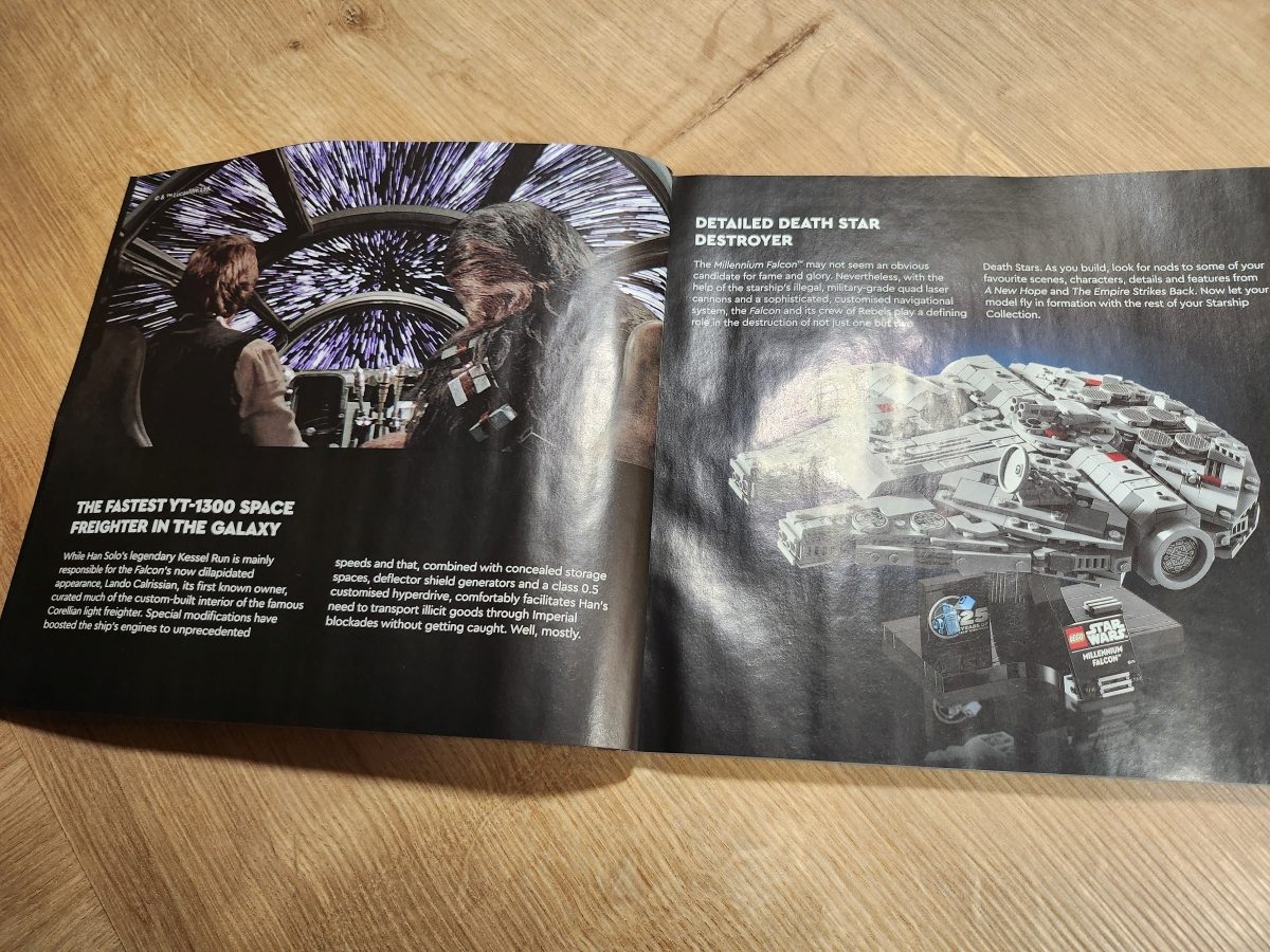 Schon die Verpackung signalisiert: Dieses Set ist Teil der 18+-Reihe und richtet sich an erwachsene Sammler. Das schwarz gehaltene Boxdesign mit feiner Grafik und Jubiläumslogo zum 25-jährigen LEGO-Star-Wars-Bestehen wirkt edel und modern. Beim Öffnen wartet eine angenehme Überraschung, keine Sticker, alles ist sauber bedruckt. Für Star Wars-Sets fast schon ein Luxus. Elf nummerierte Tüten, ein Trans-Blue-Flexschlauch und ein 182-seitiges Handbuch sorgen für ein durchdachtes Bauerlebnis. Besonders schön: In der Anleitung finden sich kleine Trivia-Abschnitte zu Design und Geschichte des Schiffs, was das Baugefühl noch immersiver macht.