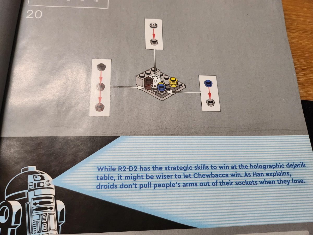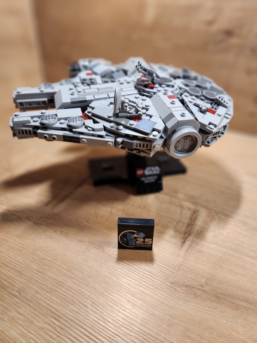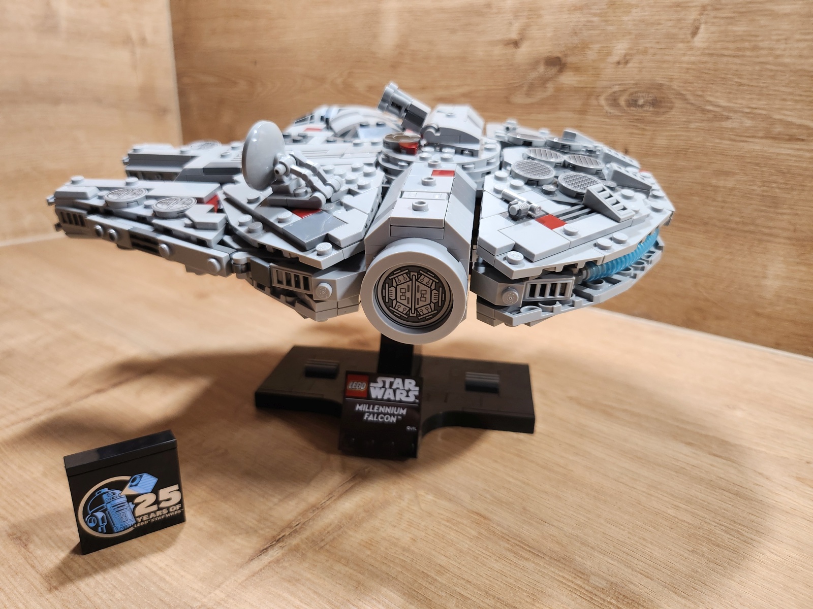 Der Verzicht auf Sticker zahlt sich visuell aus: Alle grafischen Elemente sind hochwertig bedruckt, was dem Set einen edlen, fast schon sammlerwürdigen Charakter verleiht. Neben der eleganten Präsentationsbasis mit bedrucktem Namensschild rundet der kleine 25th-Anniversary-Stein mit R2-D2-Hologramm das Gesamtbild ab. Optisch ist das Modell das perfekte Bindeglied zwischen Spielset und Vitrinenstück, kompakt genug für jedes Regal, aber mit der Ausstrahlung eines echten Sammlerstücks.