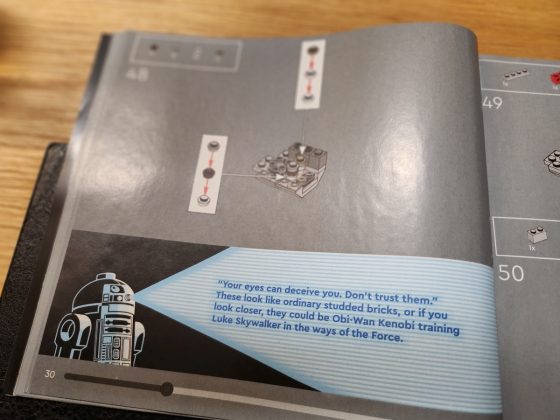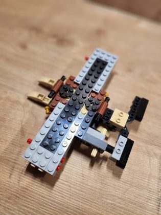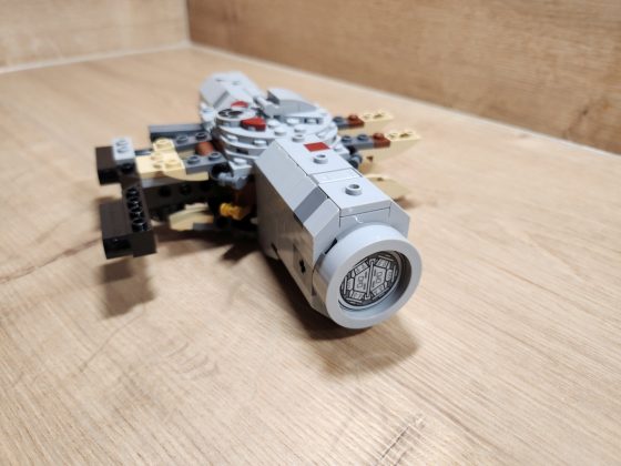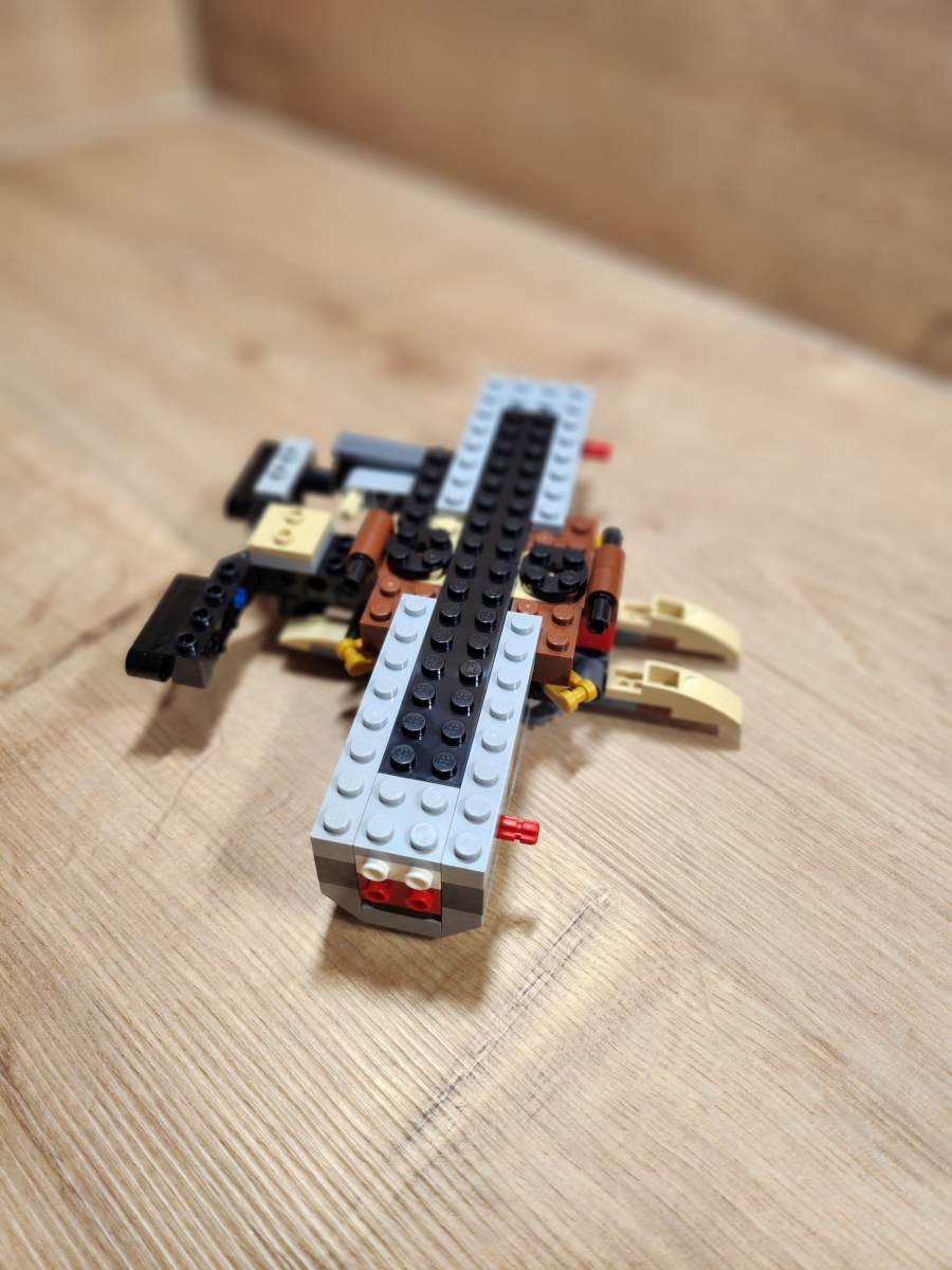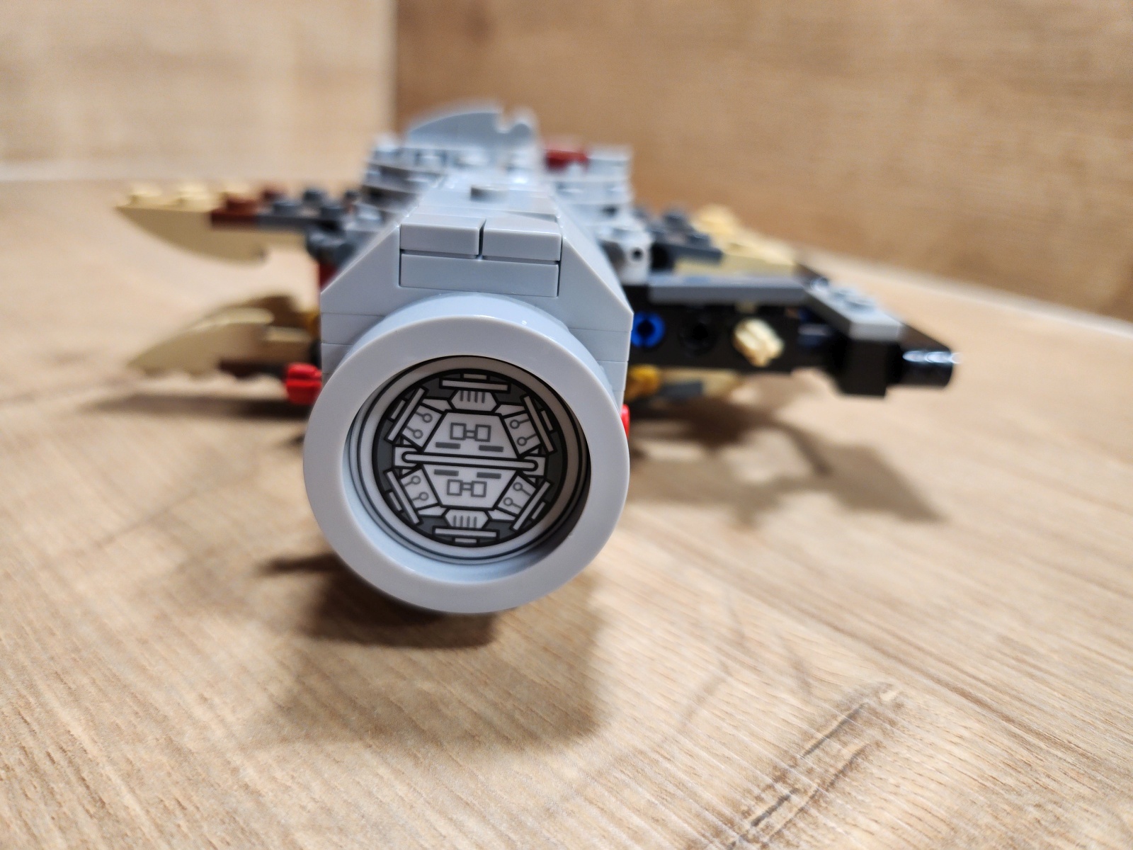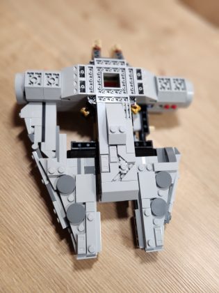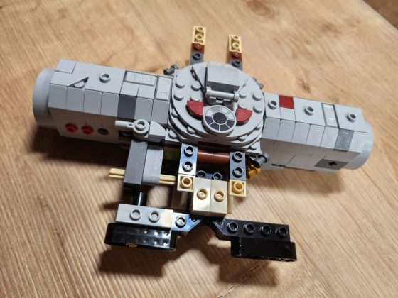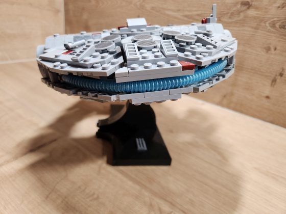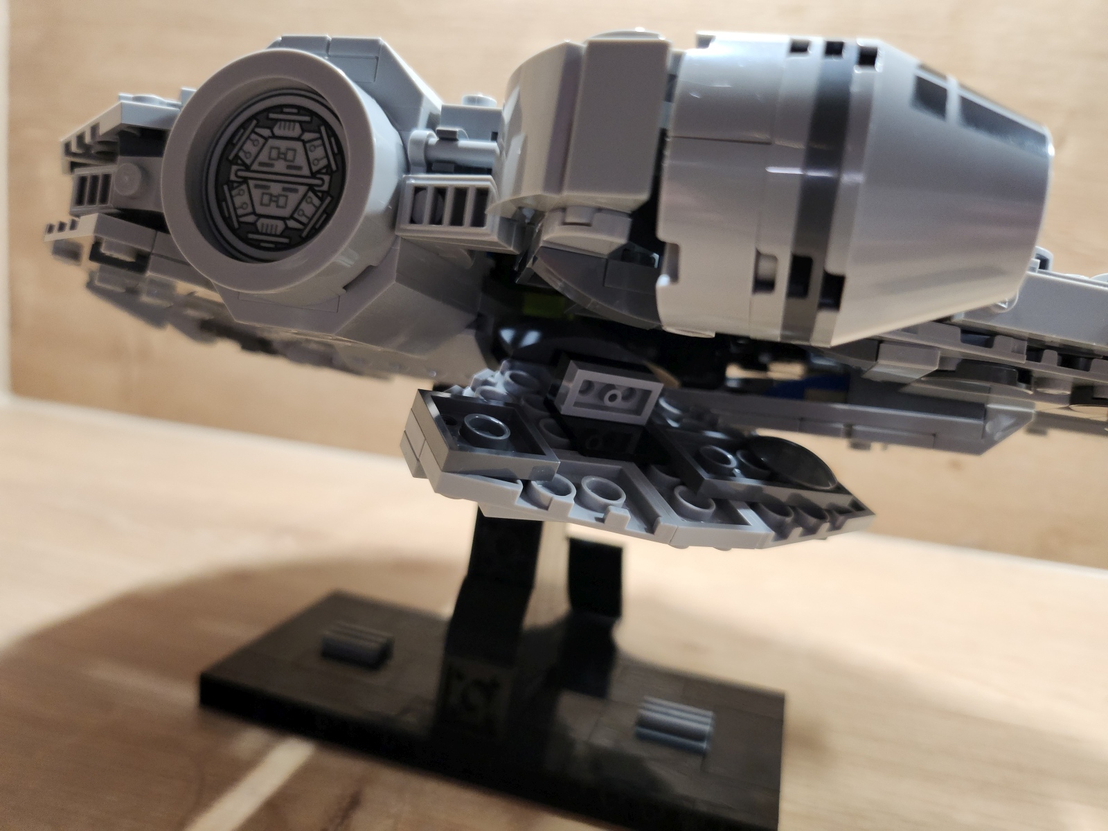 Kleine Lücken zwischen den Paneelen lassen sich aufgrund der Größe nicht vermeiden, doch sie stören den Gesamteindruck kaum. Vielmehr entsteht ein stimmiges, detailliertes Modell, das trotz seiner Kompaktheit authentisch wirkt. Auch das Display-Stativ wird bereits in der Mitte des Bauprozesses integriert, was das Arbeiten deutlich erleichtert. Das Schiff steht leicht geneigt, wodurch die Silhouette wunderbar zur Geltung kommt. Ein kleines Highlight sind die versteckten Mini-Easter-Eggs: winzige Szenen aus der Originaltrilogie, eingebaut in den Unterbau des Schiffs. Sie sind später zwar verdeckt, aber ihr Einbau zeigt, wie liebevoll das Set konzipiert wurde.