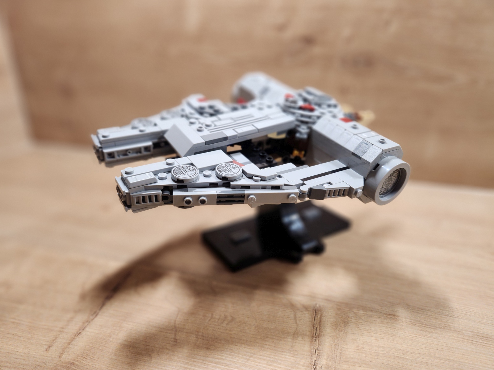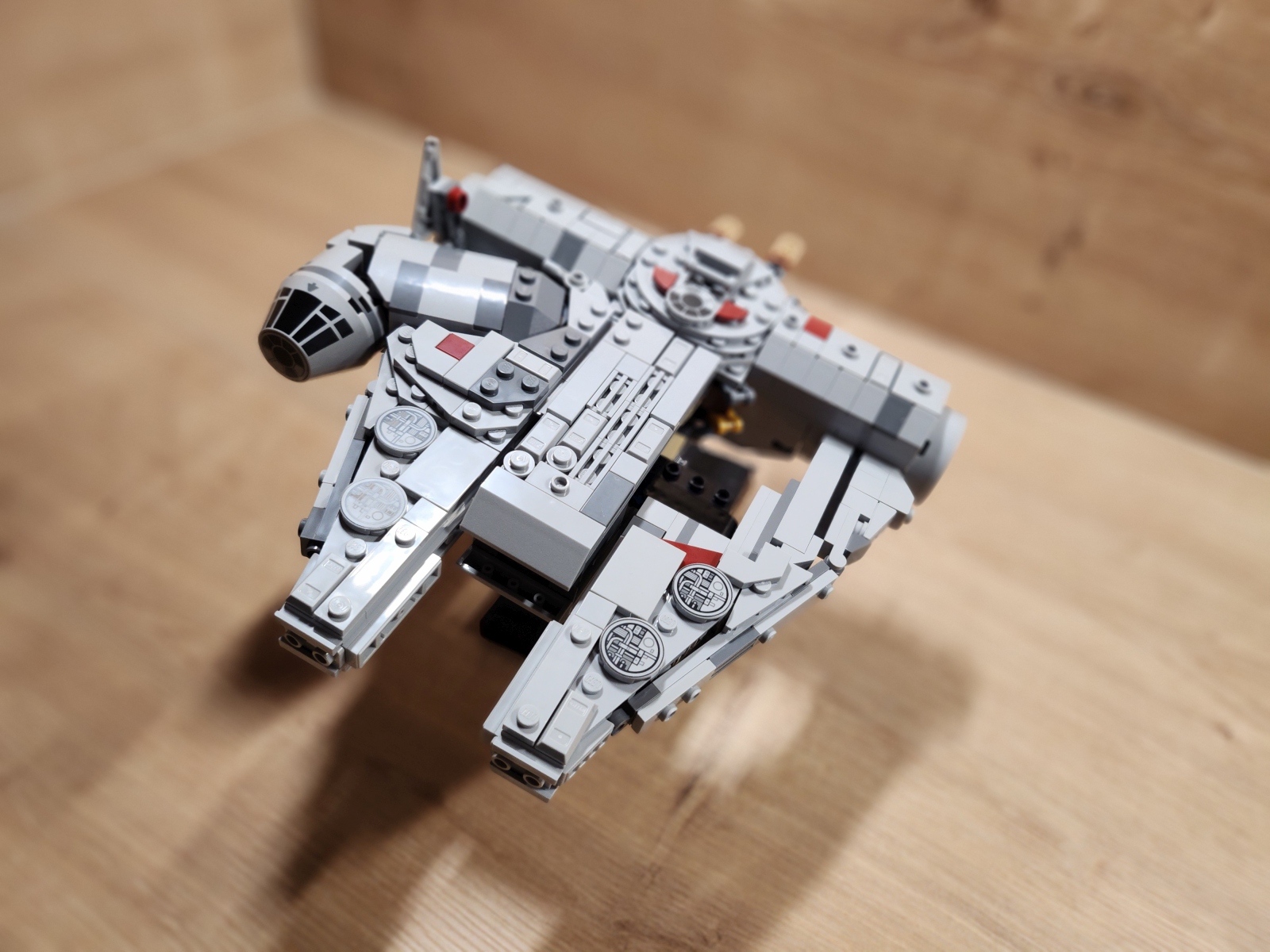 Zwar ist der Falcon klar als Display-Set gedacht, doch wer möchte, kann ihn durchaus „swooshen“. Das Modell liegt sicher in der Hand, bleibt stabil und lässt sich sogar von der Basis abnehmen. Nur allzu wilde Manöver sollte man vermeiden, ganz so robust wie ein klassisches Playset ist die Konstruktion natürlich nicht. Die Bauzeit von etwa 160 Minuten ist ideal, um das Set in einer entspannten Session fertigzustellen. Mit 921 Teilen ergibt sich ein hervorragender Kostenwert: In Kombination mit der langen Bauzeit ergibt das eine exzellente Preis-Leistungs-Verhältnis. Und der Bau macht einfach durch und durch Spaß.