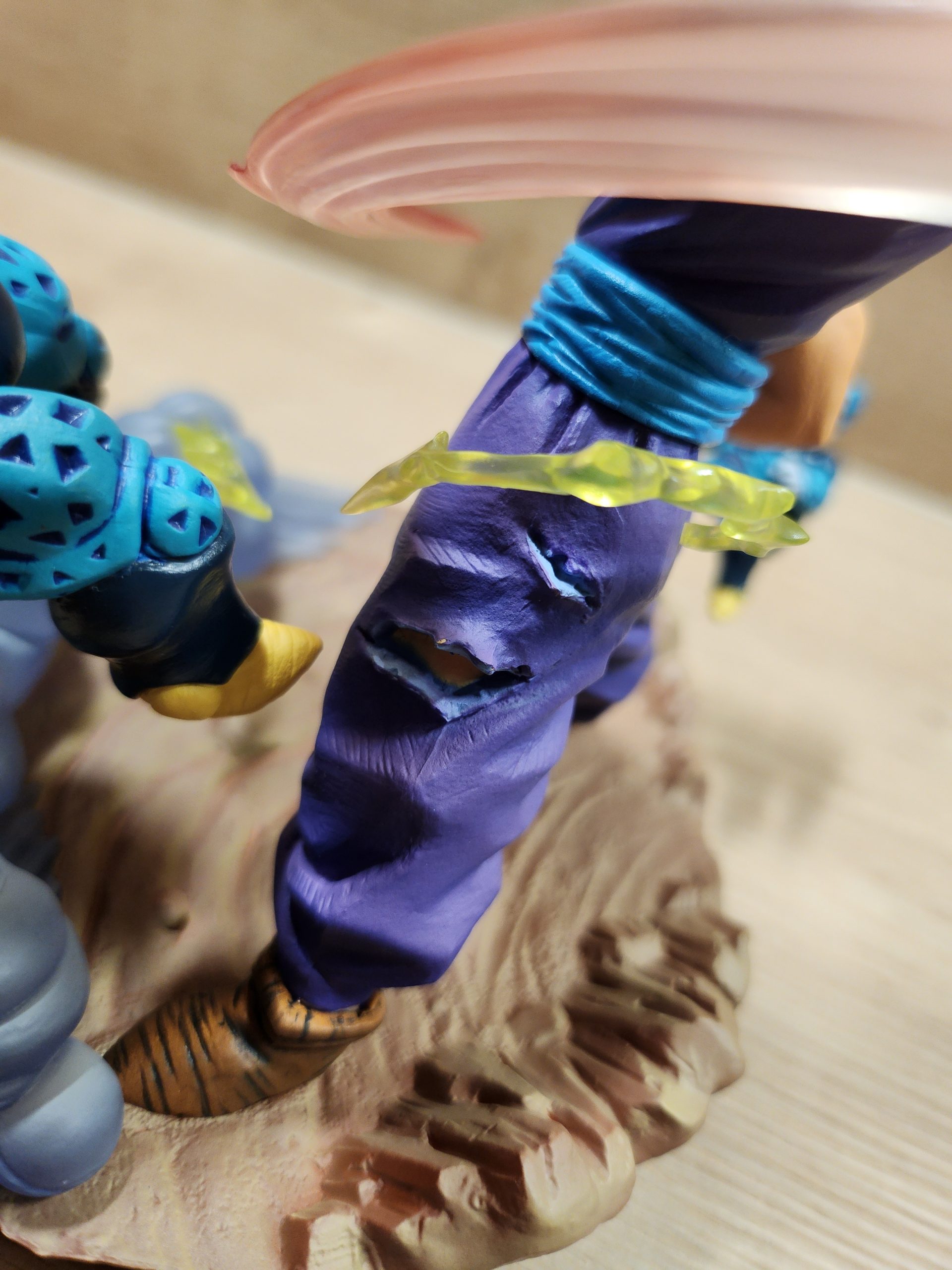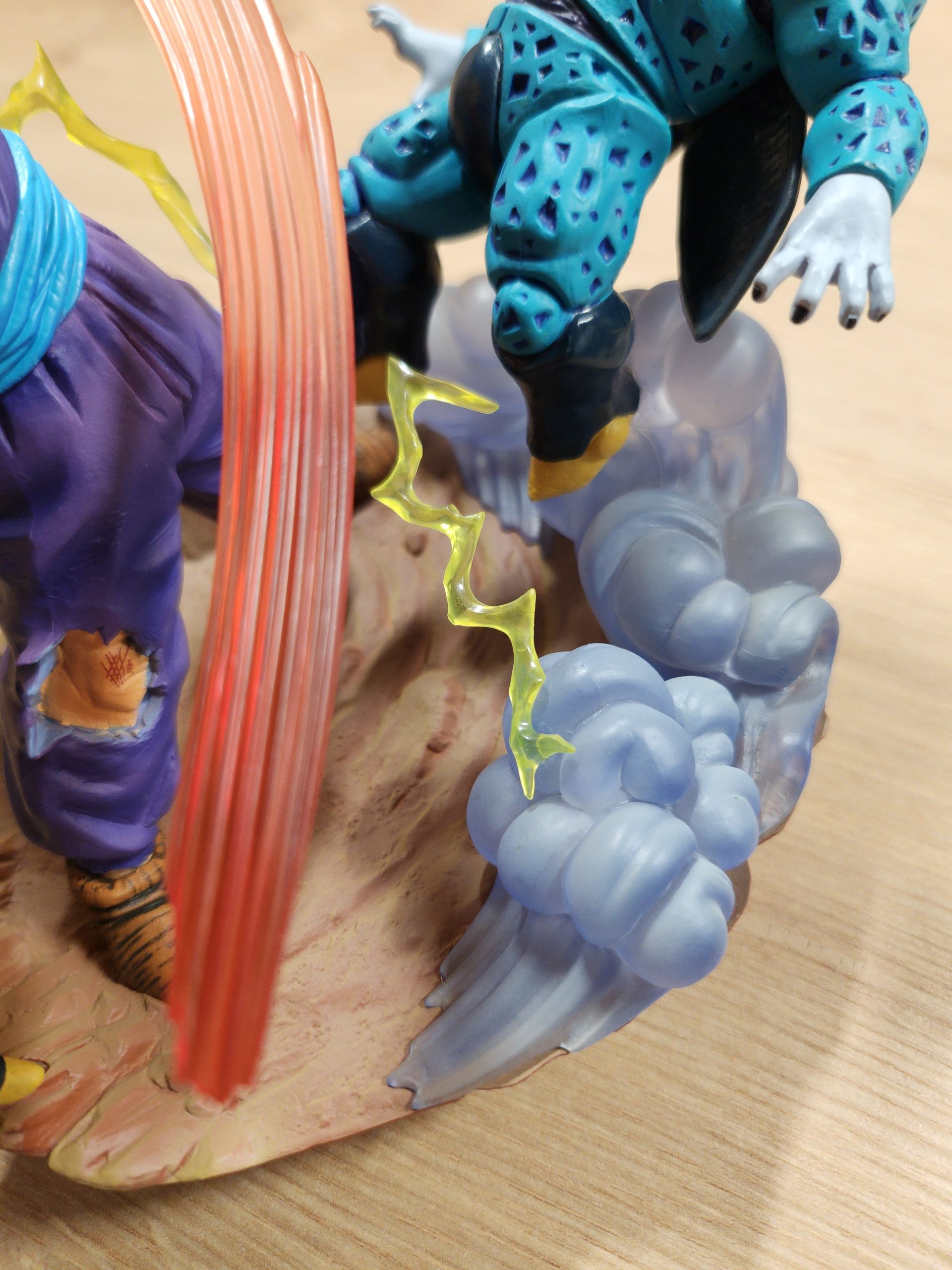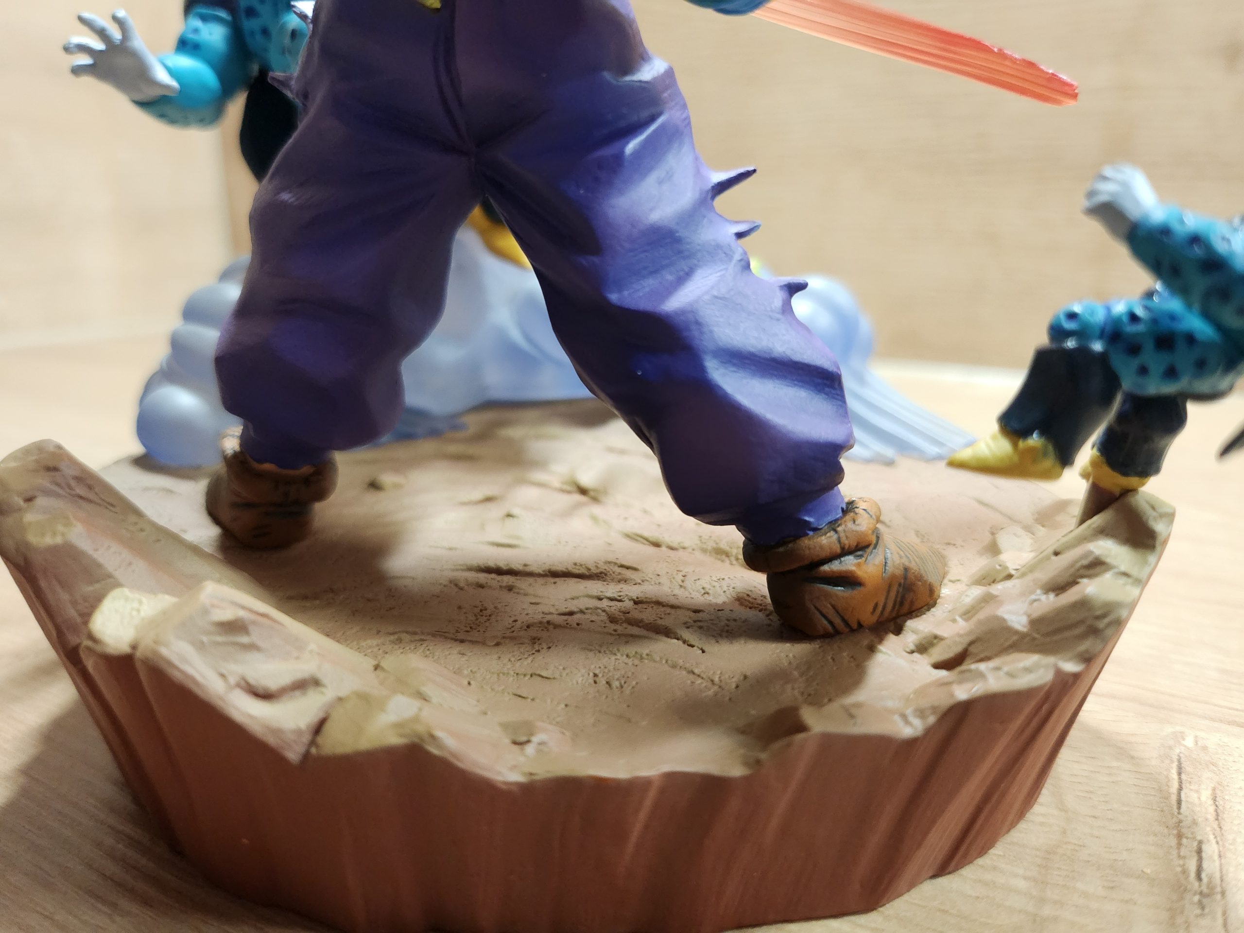 Die Farbpalette setzt auf kräftige Gelb- und Orangetöne bei der SSJ2-Aura und kontrastierend dunklere Farben für Kleidung/Falten/Tiefe. Die Bemalung schafft deutlich erkennbare Akzente, z. B. Kampfspuren am Körper, scharfe Übergänge bei Haarfarben. In Kundenfotos wirkt das Finish sauber und ohne deutliche Fehler (über Farbüberschreitungen oder Schlieren wird kaum berichtet).
