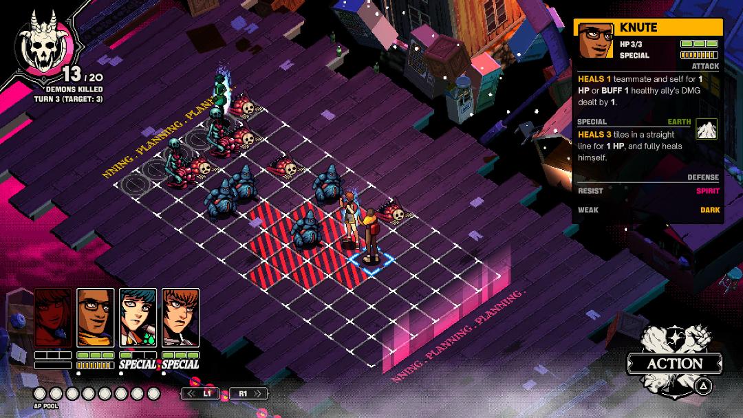 Die Kämpfe bilden das spielerische Herz von Demonschool und wirken wie eine Weiterentwicklung klassischer Taktiksysteme. Jede Einheit besitzt spezialisierte Fähigkeiten und agiert auf einem Raster. Statt typischer Levelaufstiege stützt sich das System auf Teammanagement und individuelle Anpassungen. Die Elemente reichen von Feuer und Wasser bis hin zu ungewöhnlichen Typen wie Blut oder Rost, was taktische Kombinationen ermöglicht, die man selten in anderen Spielen sieht.