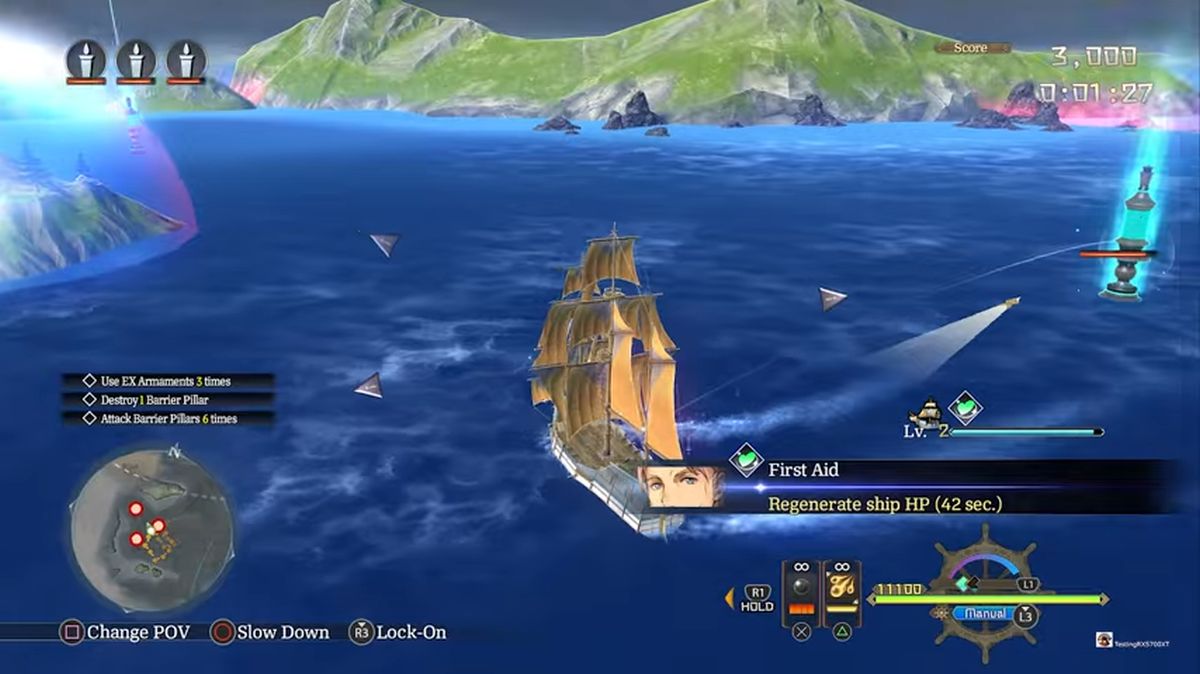 Ein Highlight ist das Schiff Sandras. Während andere Spiele versuchen, realistische Seeschlachten zu simulieren, setzt Ys X auf einen klaren Arcade-Ansatz. Die Schiffskämpfe sind direkt, übersichtlich und motivierend. Mit Upgrades verwandelt sich das anfangs fragile Boot in ein echtes Seemonster. Windpfade beschleunigen das Reisen über die Karte, während Gefechte gegen Griegr-Schiffe neue Routen freischalten. Zwar ist das reine Segeln ohne Boost etwas träge, doch insgesamt bleibt die Seefahrt spaßig und überraschend gelungen. Die Crew wächst im Verlauf der Geschichte, verwaltet Shops und Nebenquests und verleiht dem Schiff eine lebendige Funktion als mobile Basis.