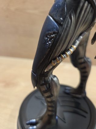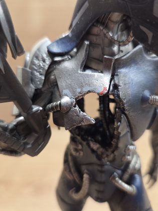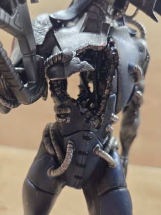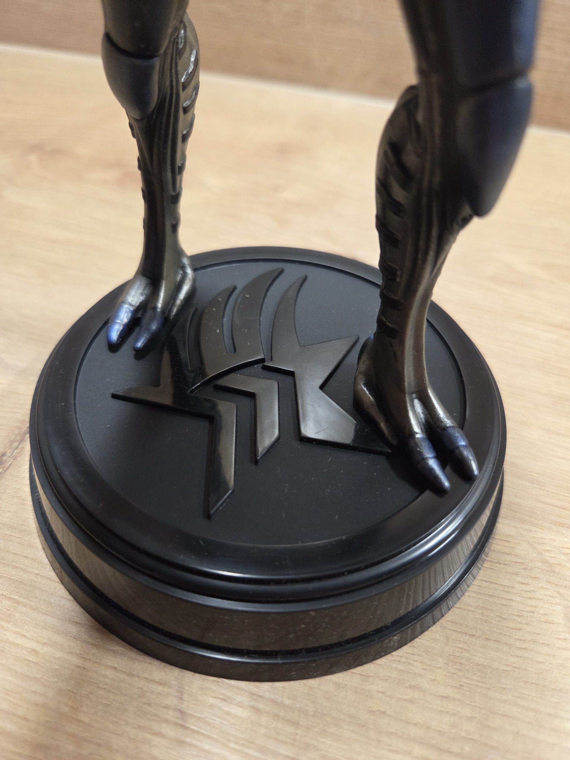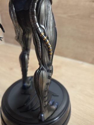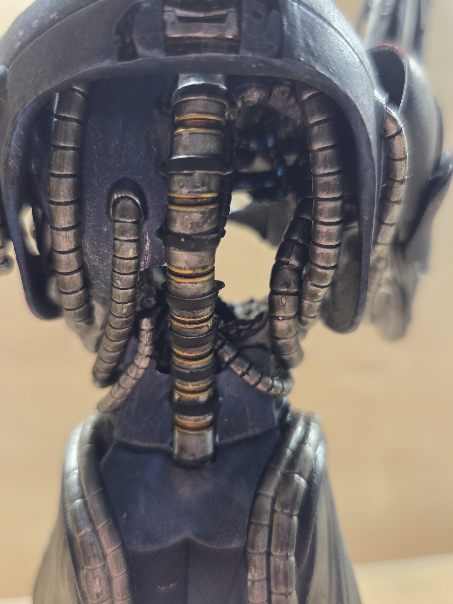 Dark Horse Direct setzt bei Legion auf einen durchdachten Materialmix. Die Basis besteht aus schwerem Polystone, wodurch die Figur einen sicheren Stand bekommt und sich wertig anfühlt. Die eigentliche Figur kombiniert Vinyl und präzise modellierte Kunststoffelemente, um feine Details zu ermöglichen, ohne dass die Konstruktion spröde wirkt. Was sofort auffällt, ist die saubere Ausarbeitung der mechanischen Strukturen. Die Segmentierungen an Armen und Beinen, die Platten am Oberkörper und die komplexe Kopfstruktur sind nicht nur grob angedeutet, sondern klar definiert. Es gibt keine unsauberen Gusskanten, keine störenden Übergänge und keine sichtbaren Produktionsrückstände. Alles wirkt bewusst gestaltet.