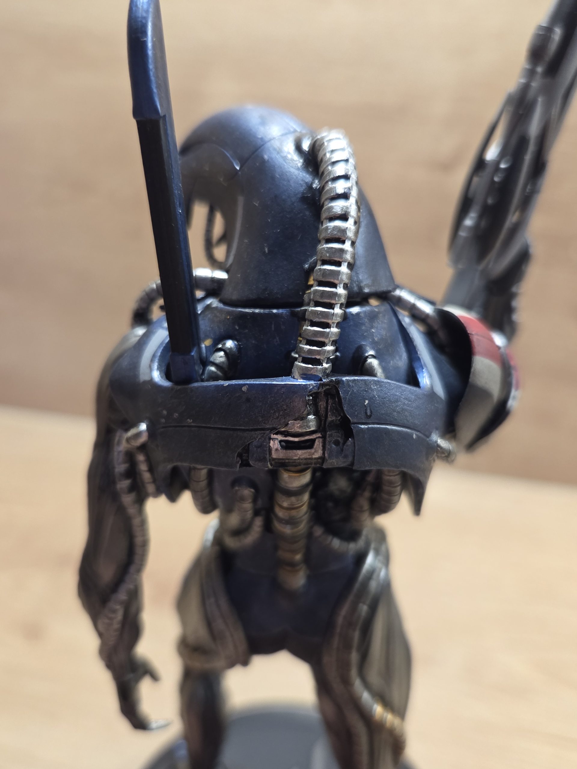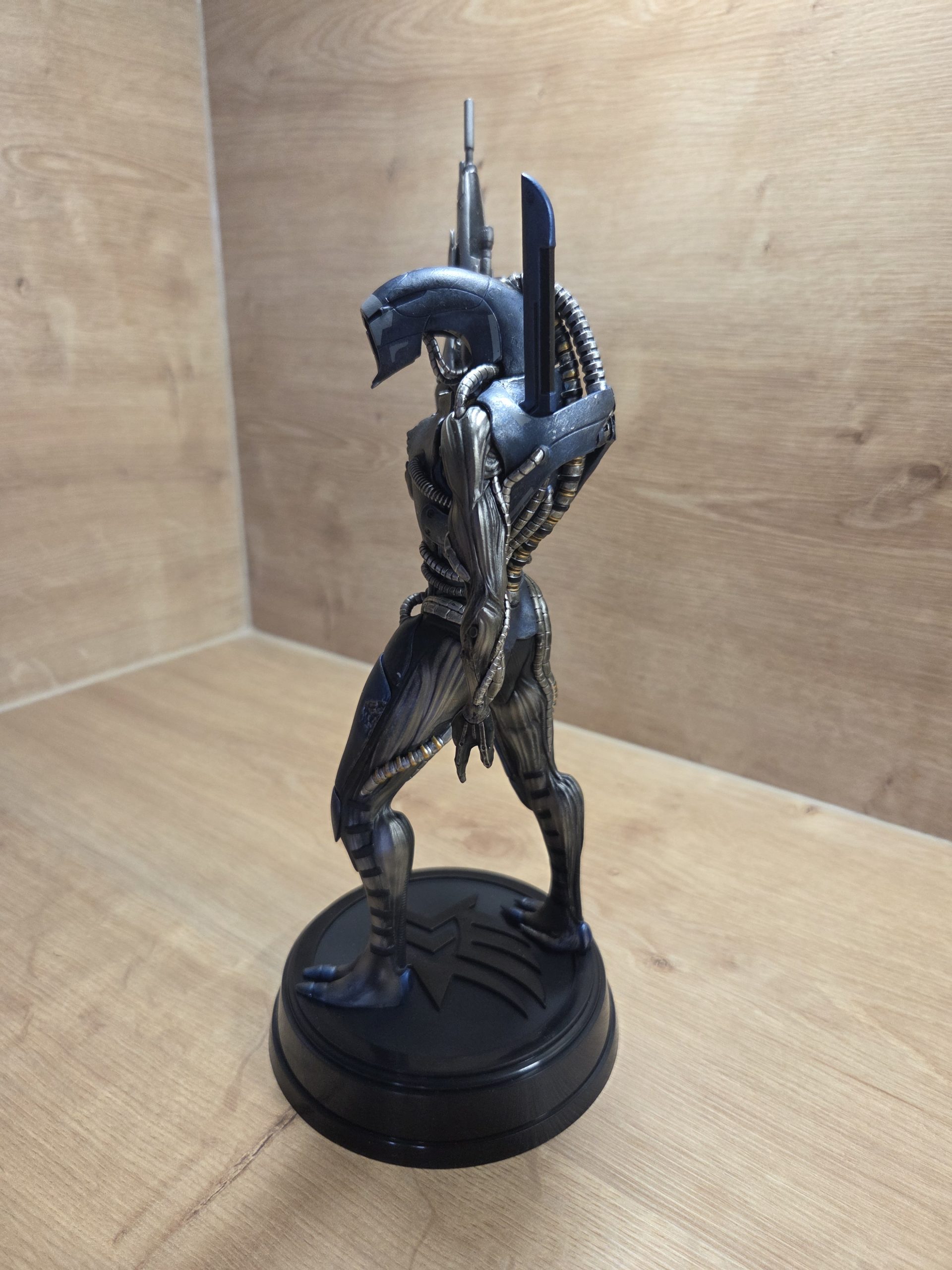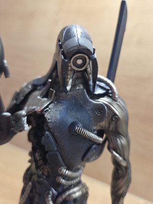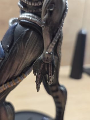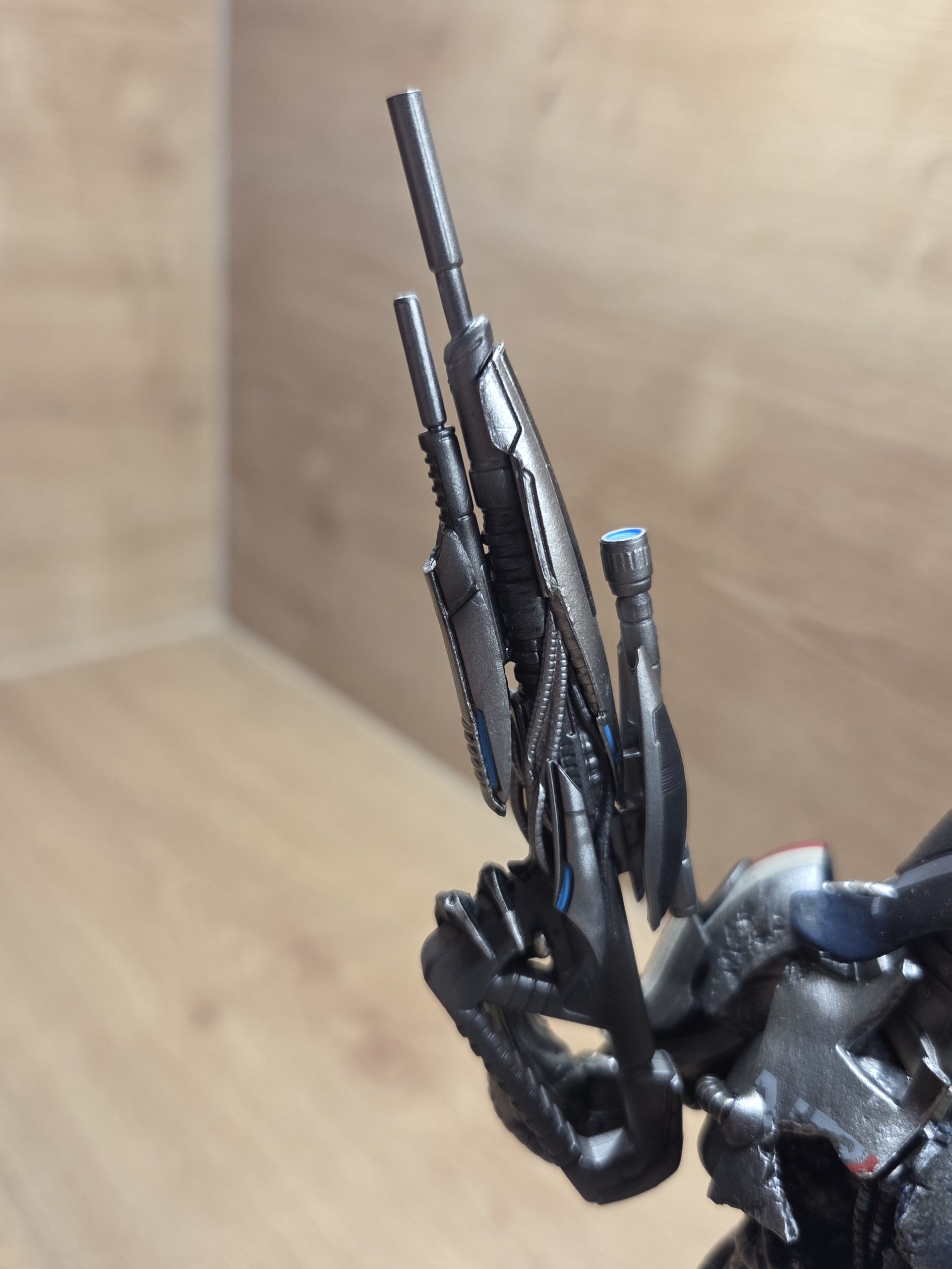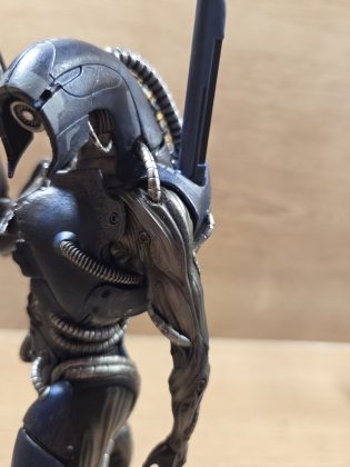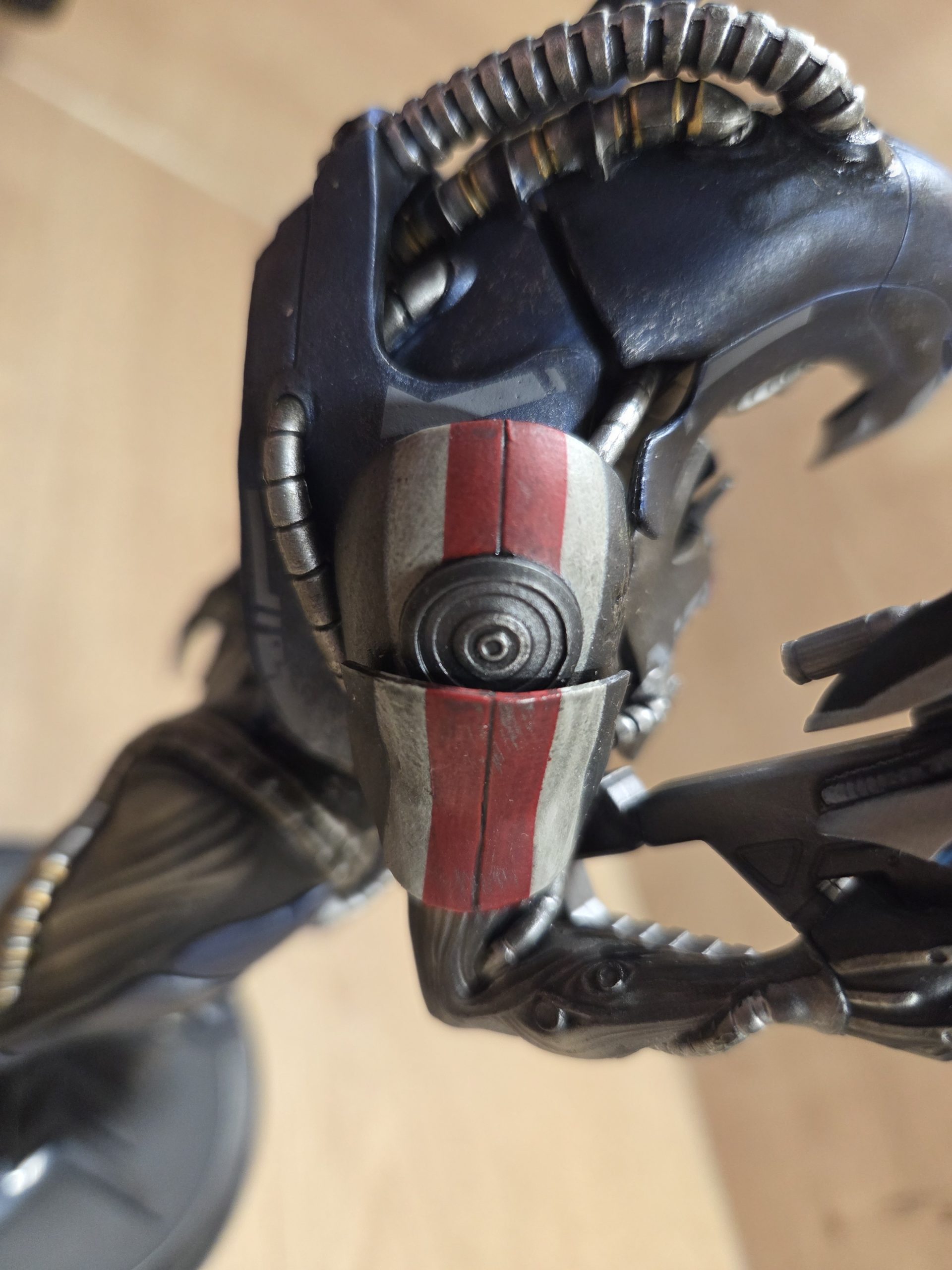 Was diese Figur besonders auszeichnet, ist die Qualität des Sculptings. Legion besteht im Spiel aus tausenden modularen Komponenten – eine Herausforderung für jede physische Umsetzung. Dennoch gelingt es Dark Horse, die komplexe Formensprache überzeugend zu übertragen. Der Kopfbereich mit der markanten zentralen Optik ist besonders gelungen. Die feinen Linien, die mechanischen Übergänge und die asymmetrischen Details erzeugen Tiefe und Charakter. Auch aus nächster Nähe wirken die Strukturen nicht weich oder vereinfacht, sondern klar definiert. Die Pose bleibt bewusst ruhig, aber keineswegs statisch. Kleine Gewichtsverlagerungen und die leicht geneigte Kopfhaltung verleihen dem Modell Leben, ohne in Übertreibung abzudriften. Legion wirkt nicht wie ein eingefrorener Actionmoment, sondern wie eine Figur, die gleich beginnen könnte zu sprechen.