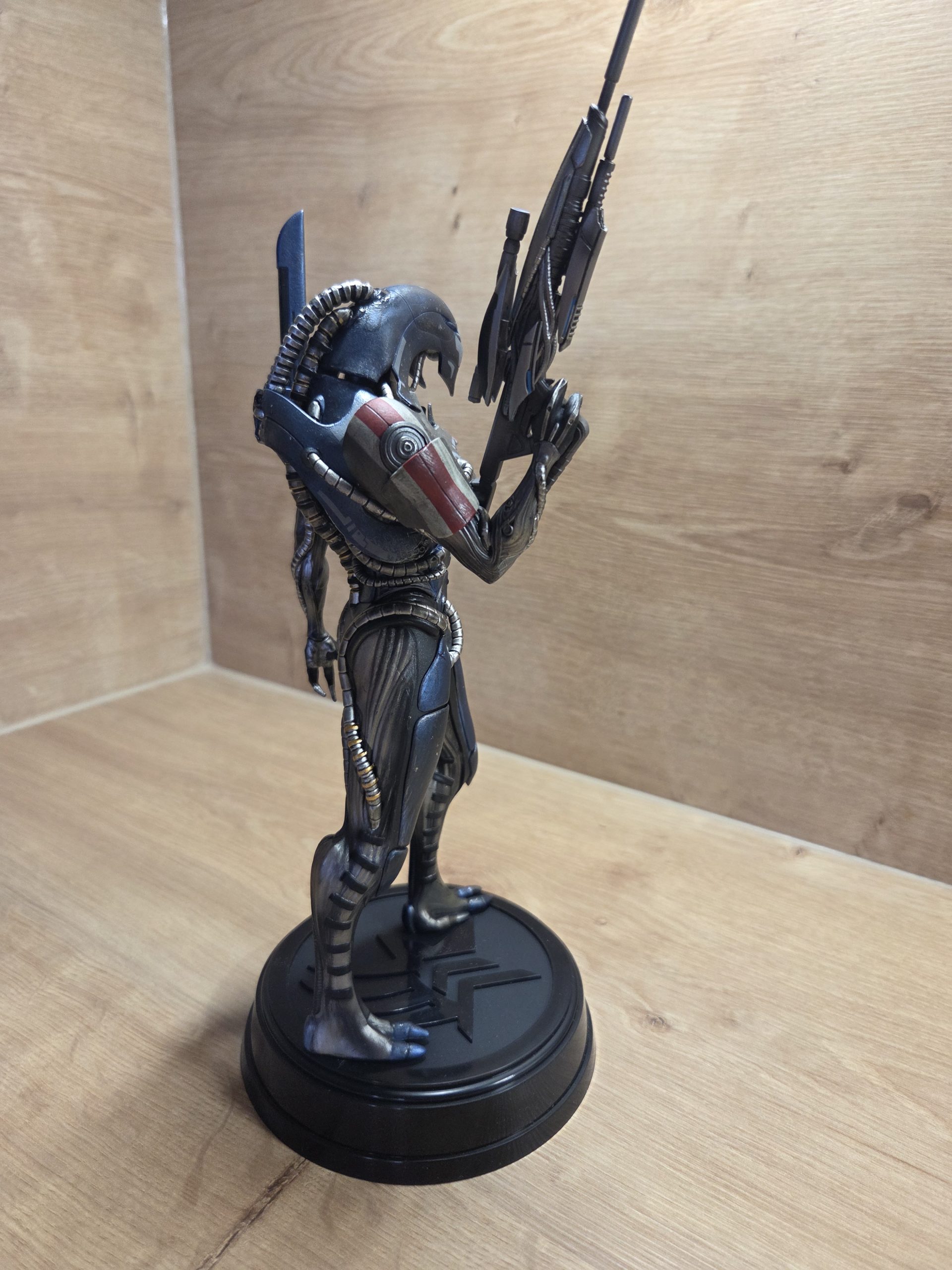 Die Base ist stabil, schlicht und funktional. Sie unterstützt das Modell, ohne ihm die Aufmerksamkeit zu stehlen. Das ist wichtig, denn Legion selbst ist das Zentrum der Komposition. Durch die dunkle Farbgebung fügt sich die Figur problemlos in unterschiedliche Sammlungsumgebungen ein, egal ob neben anderen Mass-Effect-Charakteren oder in einer allgemeinen Sci-Fi-Sammlung. In einer gut beleuchteten Vitrine entfaltet das Modell eine starke Präsenz. Besonders seitliche Lichtquellen lassen die mechanischen Details plastischer erscheinen und betonen die Texturen.