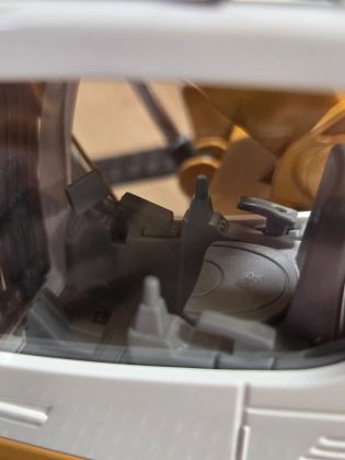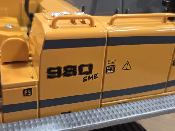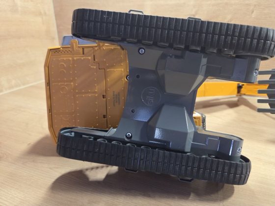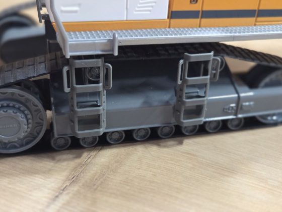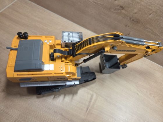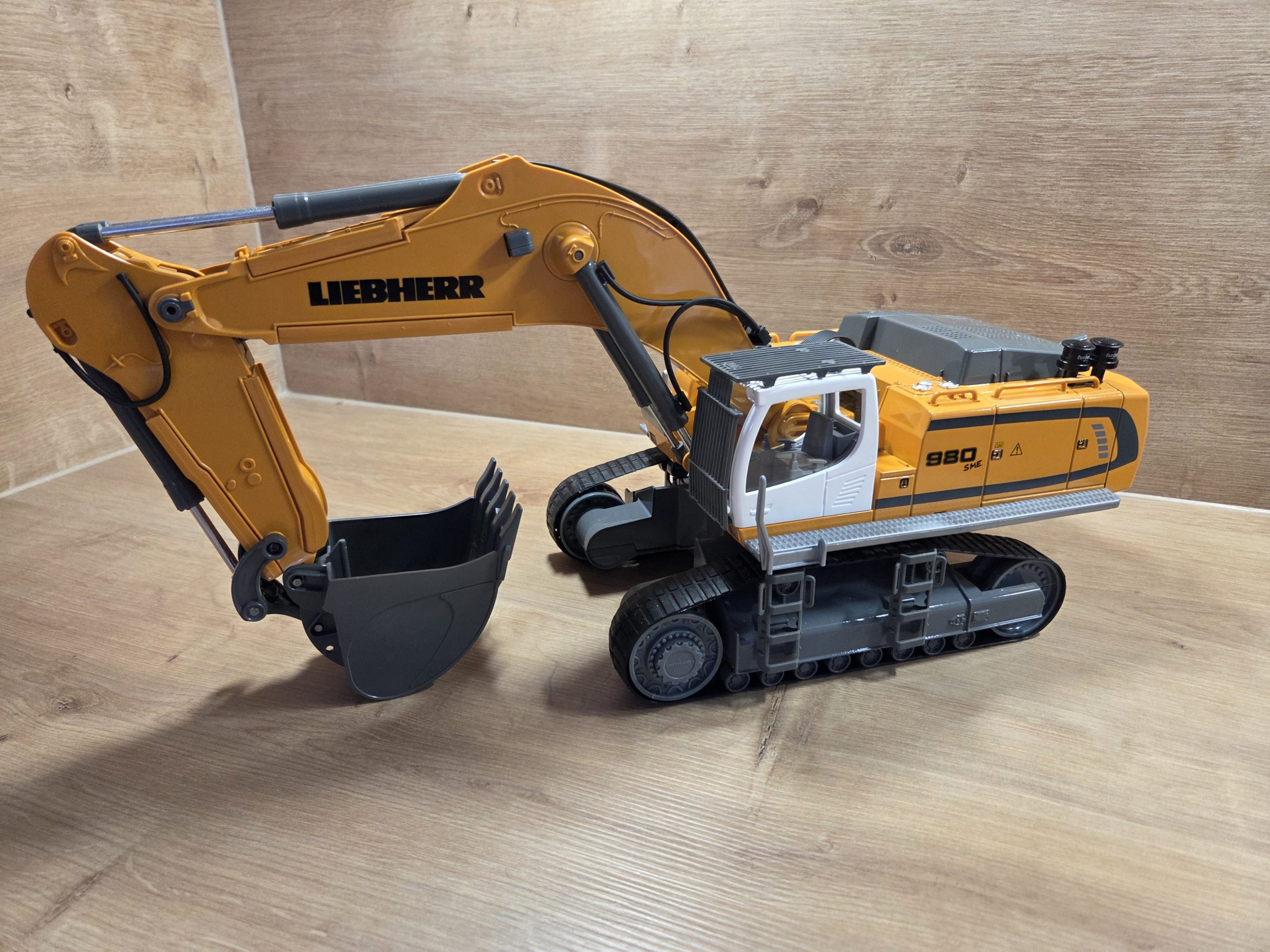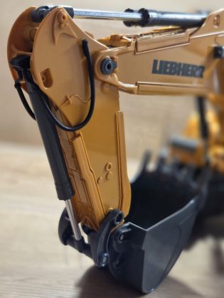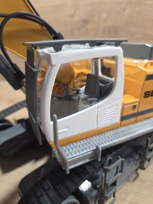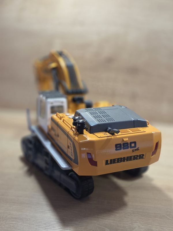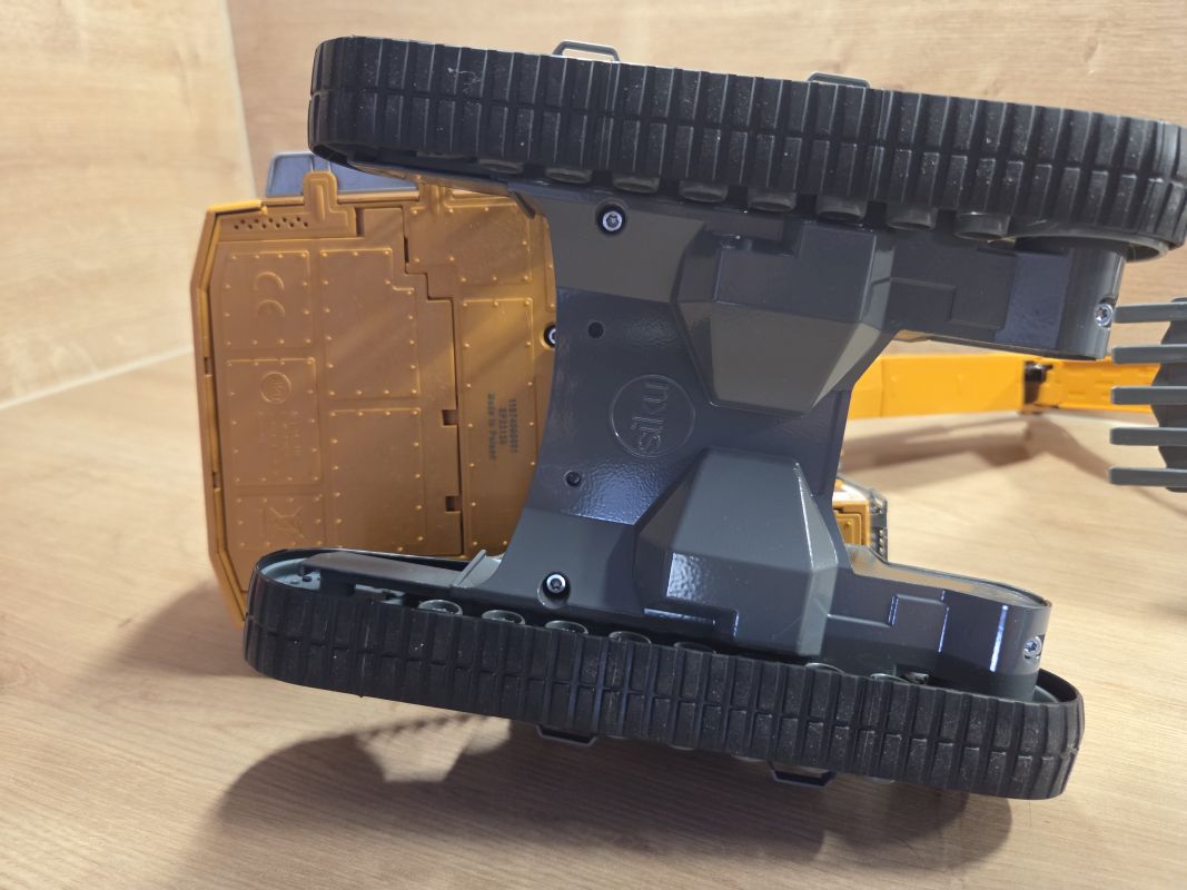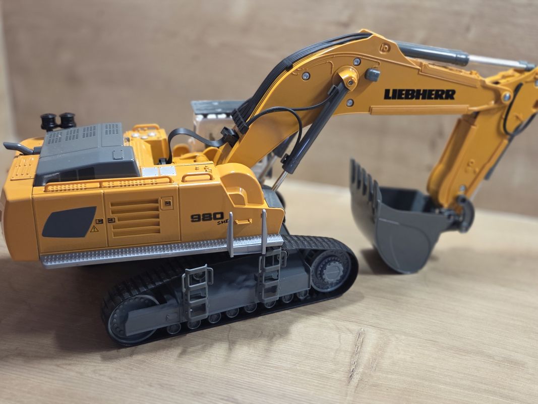 Schon beim ersten Blick fällt auf, dass der Liebherr R980 SME kein kleines Spielzeug ist. Das Modell wirkt massiv, technisch und ausgesprochen detailreich. Die Proportionen orientieren sich eng am realen Großbagger, und durch den großen Maßstab wirkt das Fahrzeug im Regal oder auf der Spielfläche beeindruckend präsent. Das Raupenfahrgestell besteht größtenteils aus Metall und vermittelt sofort ein solides Gefühl. Diese Bauweise sorgt nicht nur für Stabilität, sondern verleiht dem Modell auch ein realistisches Gewicht. Das Maschinenhaus ist ebenfalls sehr detailliert gestaltet. Lüftungsgitter, Kabine und Karosserieelemente sind sauber modelliert und orientieren sich sichtbar am Vorbild aus dem Hause Liebherr.