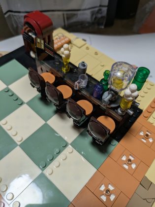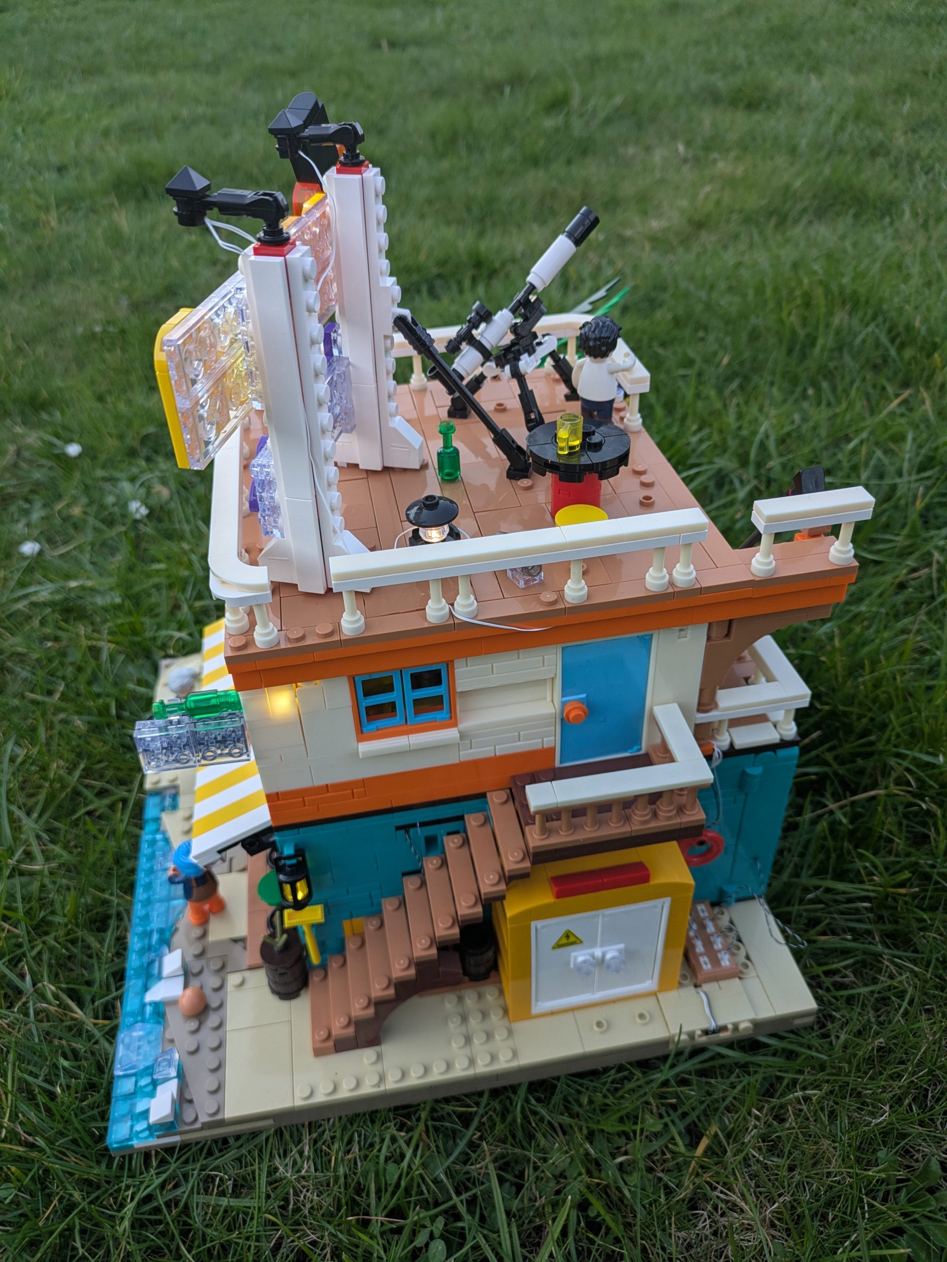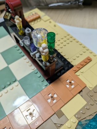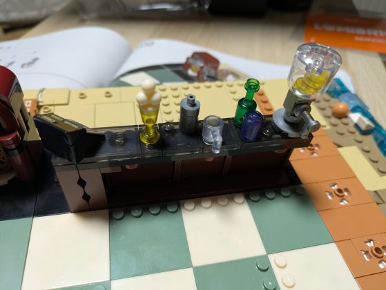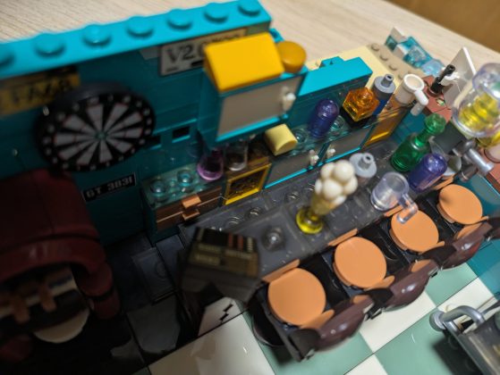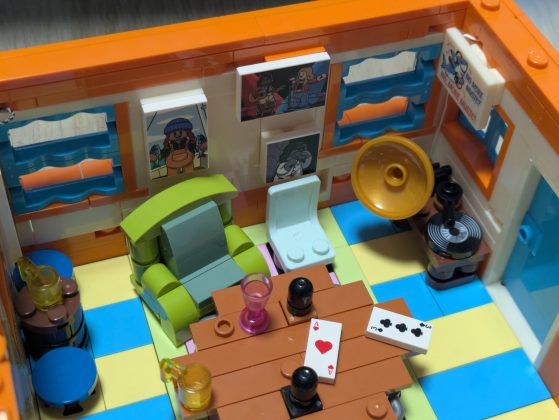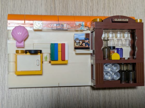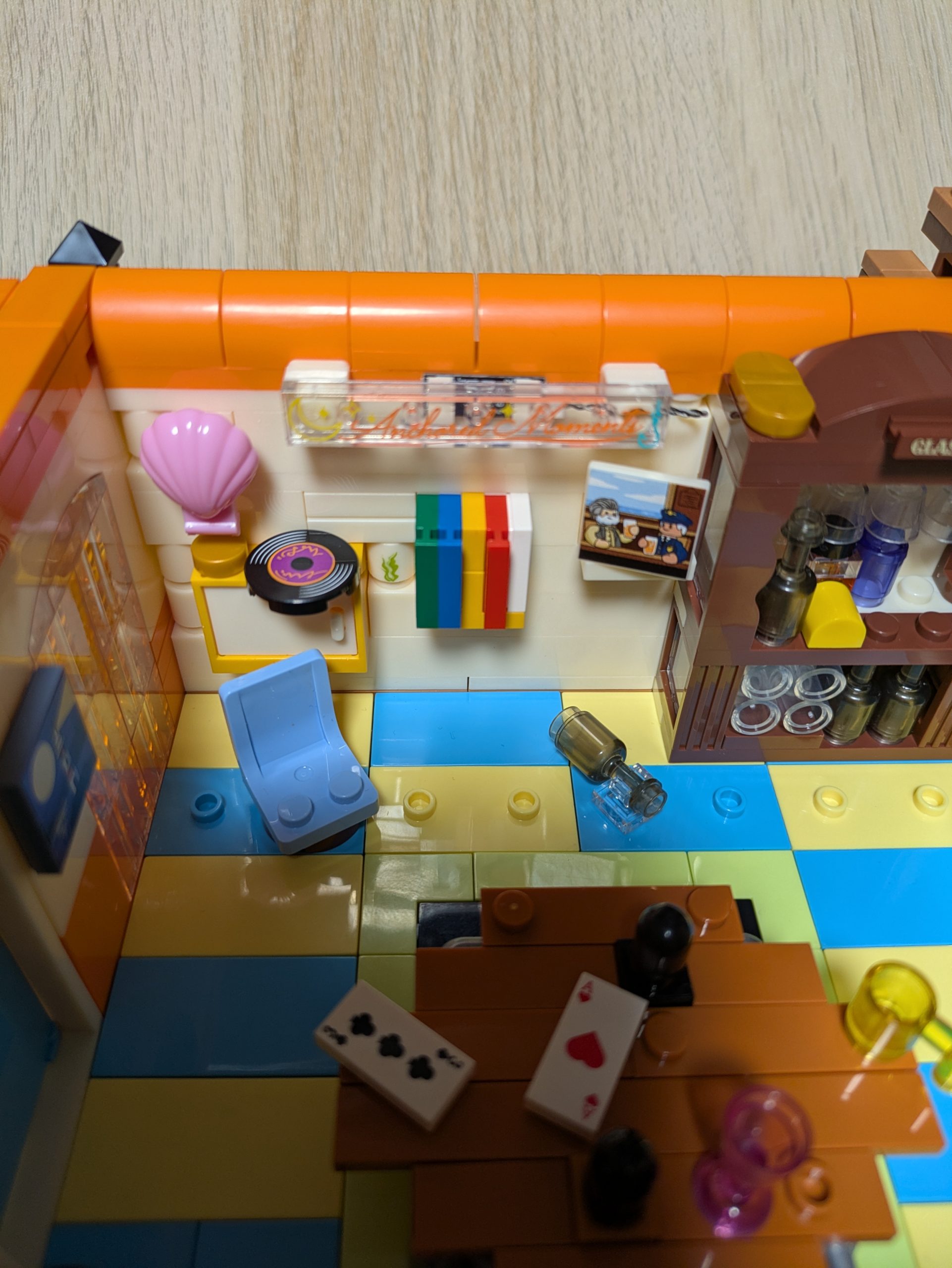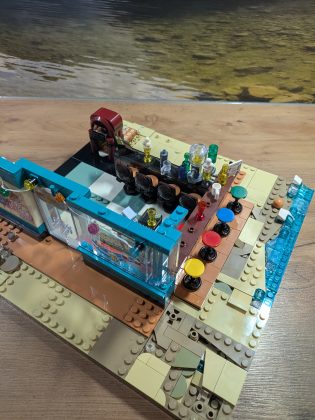 Diese Innenräume gehören zu den Stärken vieler Lumibricks-Sets, da sie meist mit überraschend vielen kleinen Details ausgestattet sind. Der obere Bereich des Gebäudes wird anschließend mit einer Dachstruktur abgeschlossen. Oft enthalten Lumibricks-Sets hier zusätzliche Szenen, etwa eine Dachterrasse oder Lounge-Ecke. Die Moon Bar nutzt diesen Raum vermutlich ebenfalls als kleinen Außenbereich mit Blick auf das Meer.