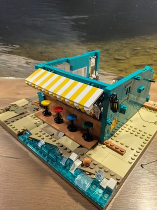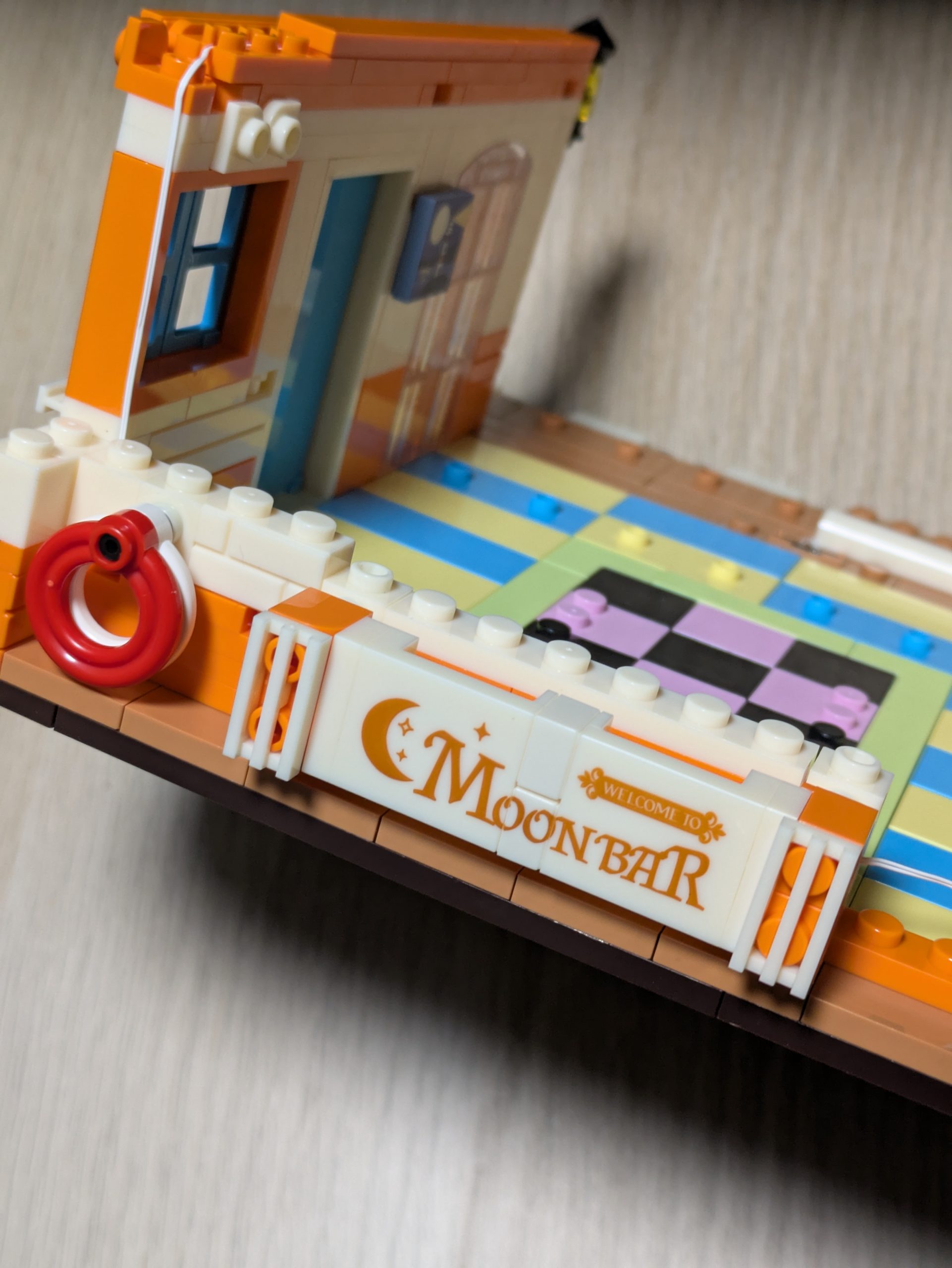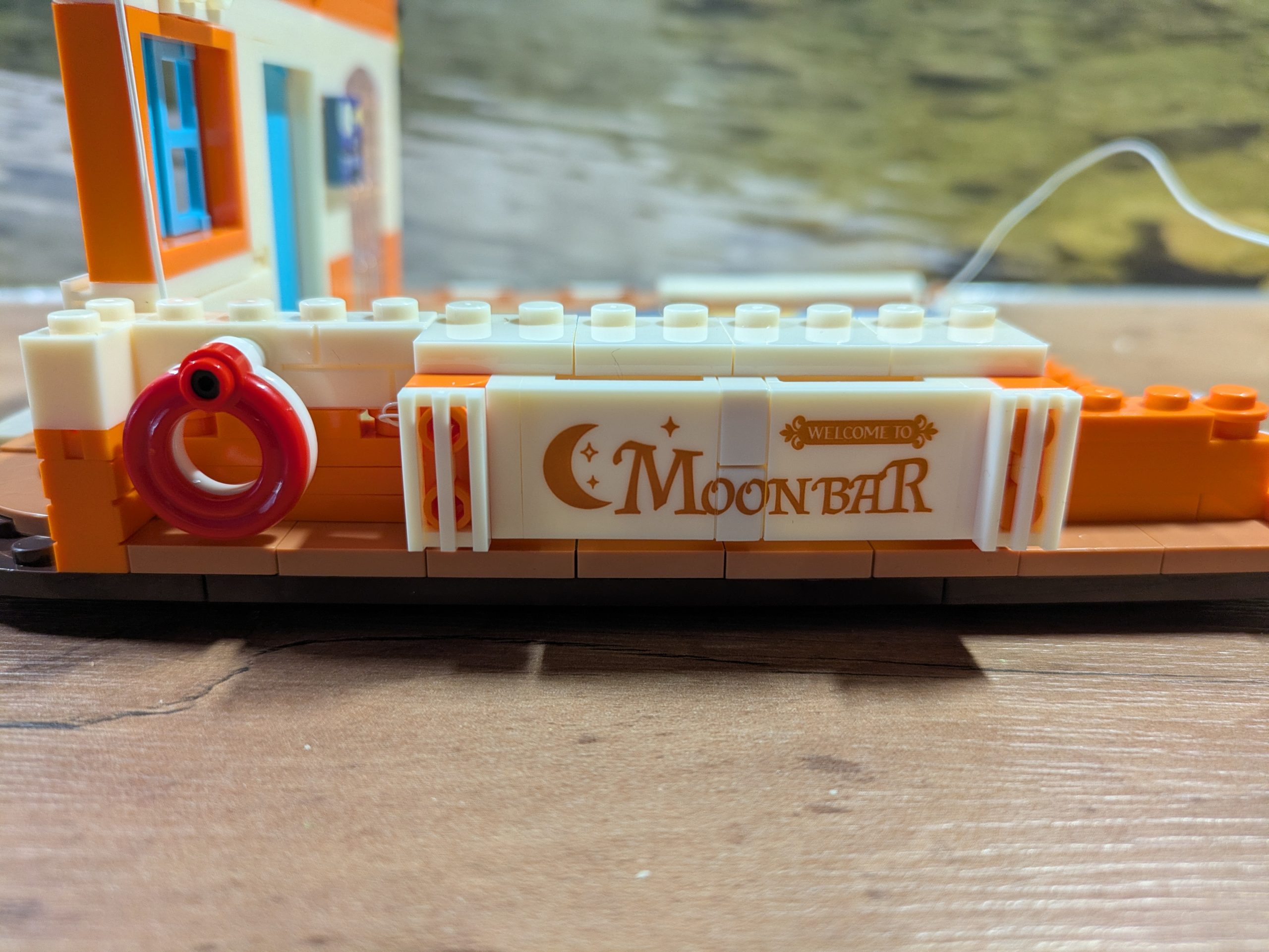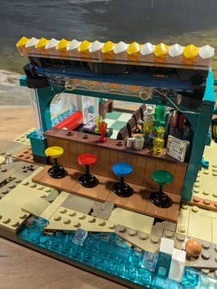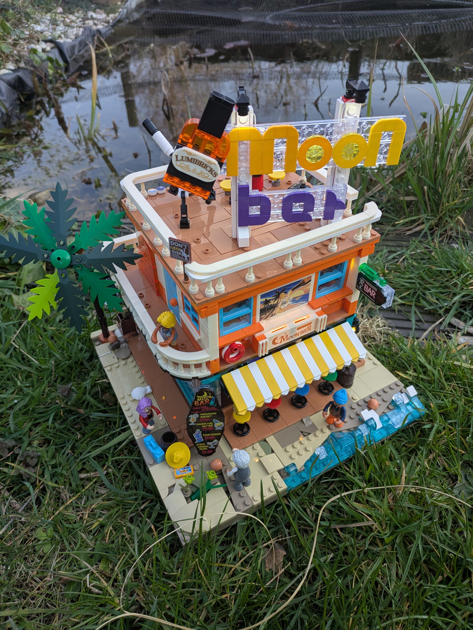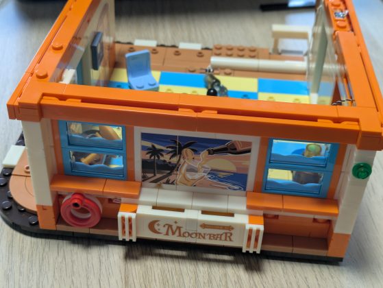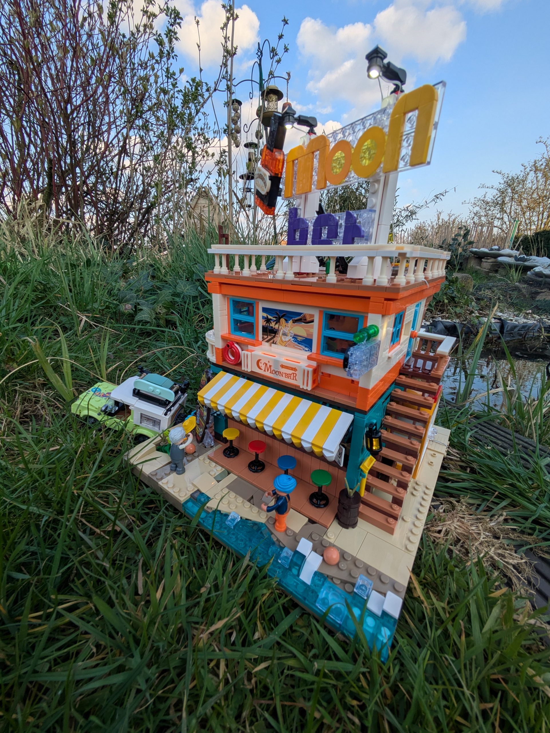 Das Modell stellt eine Strandbar mit Terrasse dar, die direkt an einer Küstenpromenade liegt. Architektur und Farbgebung orientieren sich stark an tropischen Bars oder Surfer-Locations. Typische Elemente des Designs sind eine offene Barfront mit Tresen, eine Dachterrasse oder der Balkonbereich, ein Neon-Bar-Schild und natürlich Strand- oder Küstendekoration und das Set bietet dabei auch wirklich alles. Die Gestaltung erinnert an klassische Strandbars aus Filmen oder Videospielen. Orte, an denen man sich nach einem Tag am Meer trifft. Besonders auffällig ist das große „Moon Bar“-Schild, das aus Klemmbausteinen konstruiert ist und durch Beleuchtung hervorgehoben wird. Dieses Schild ist gleichzeitig ein prägendes Element des gesamten Gebäudes.