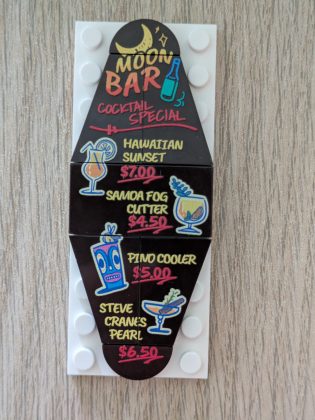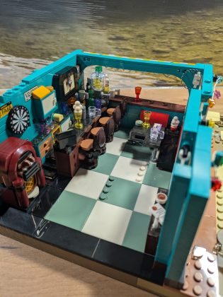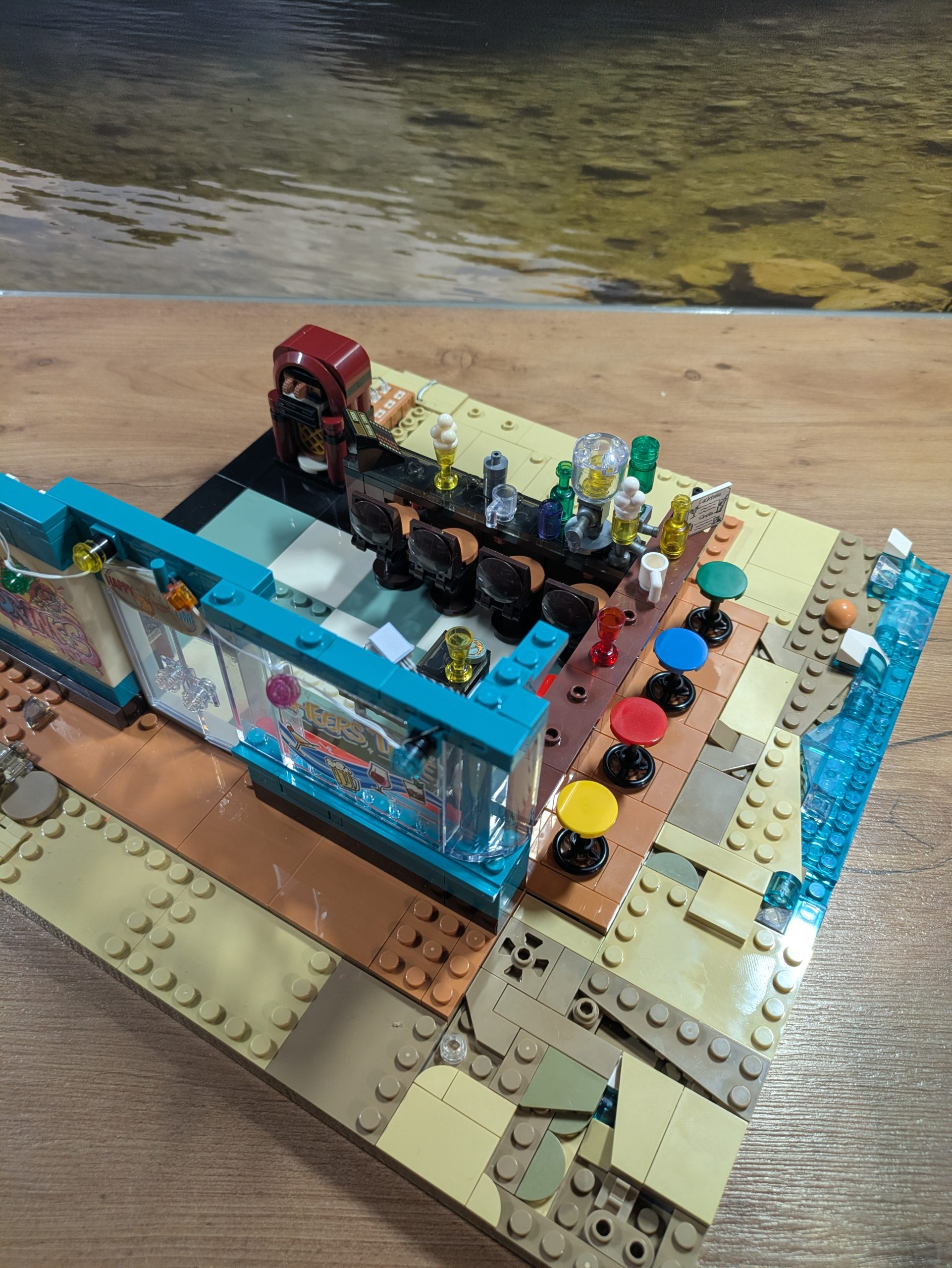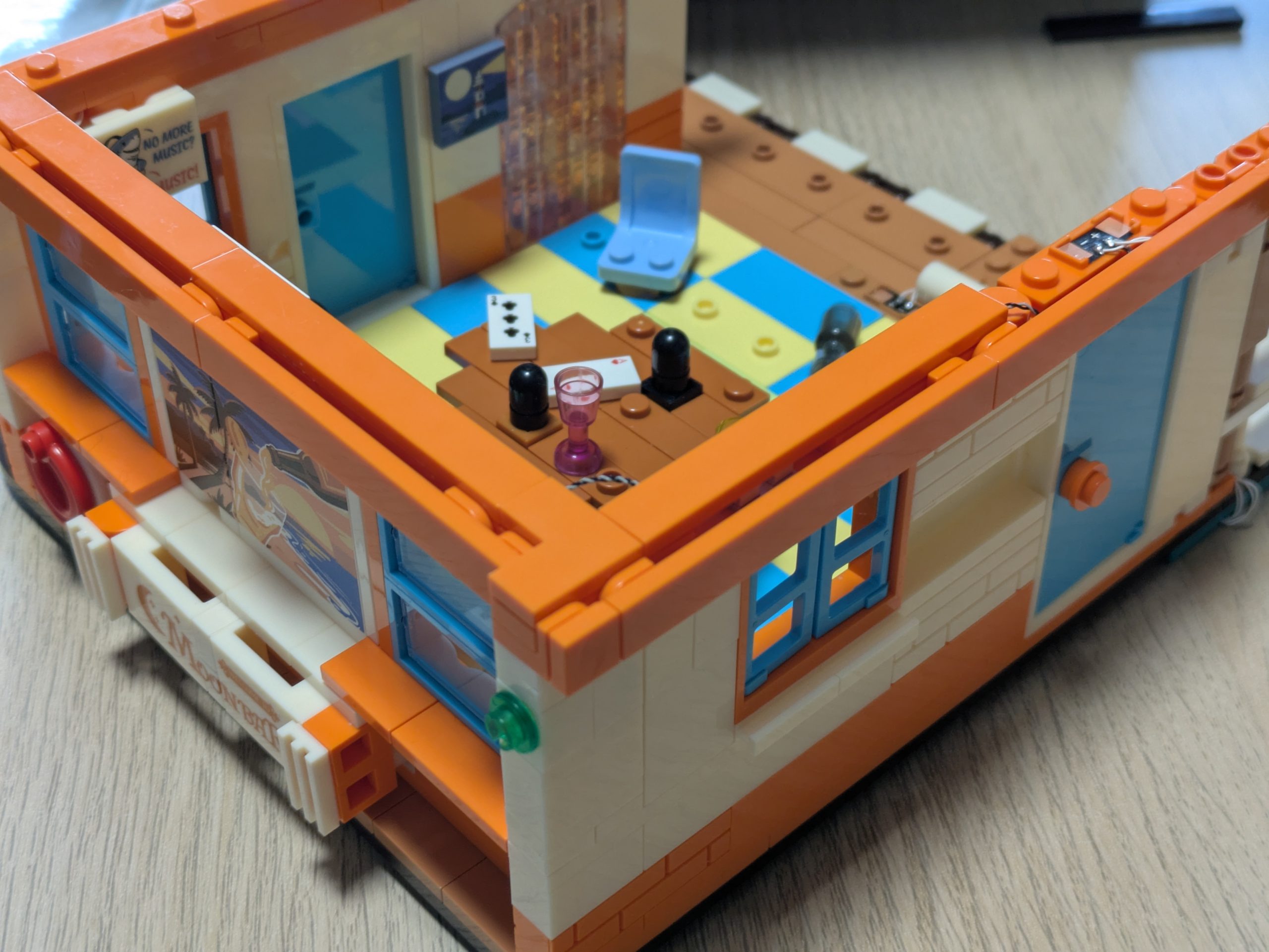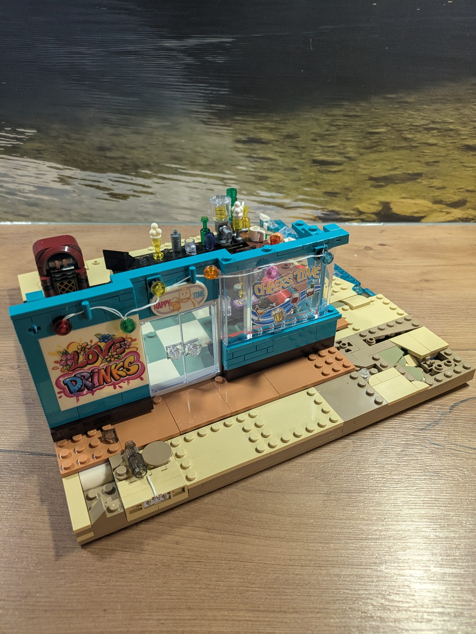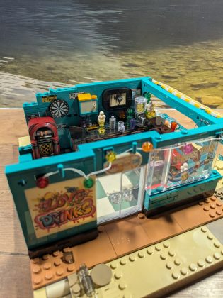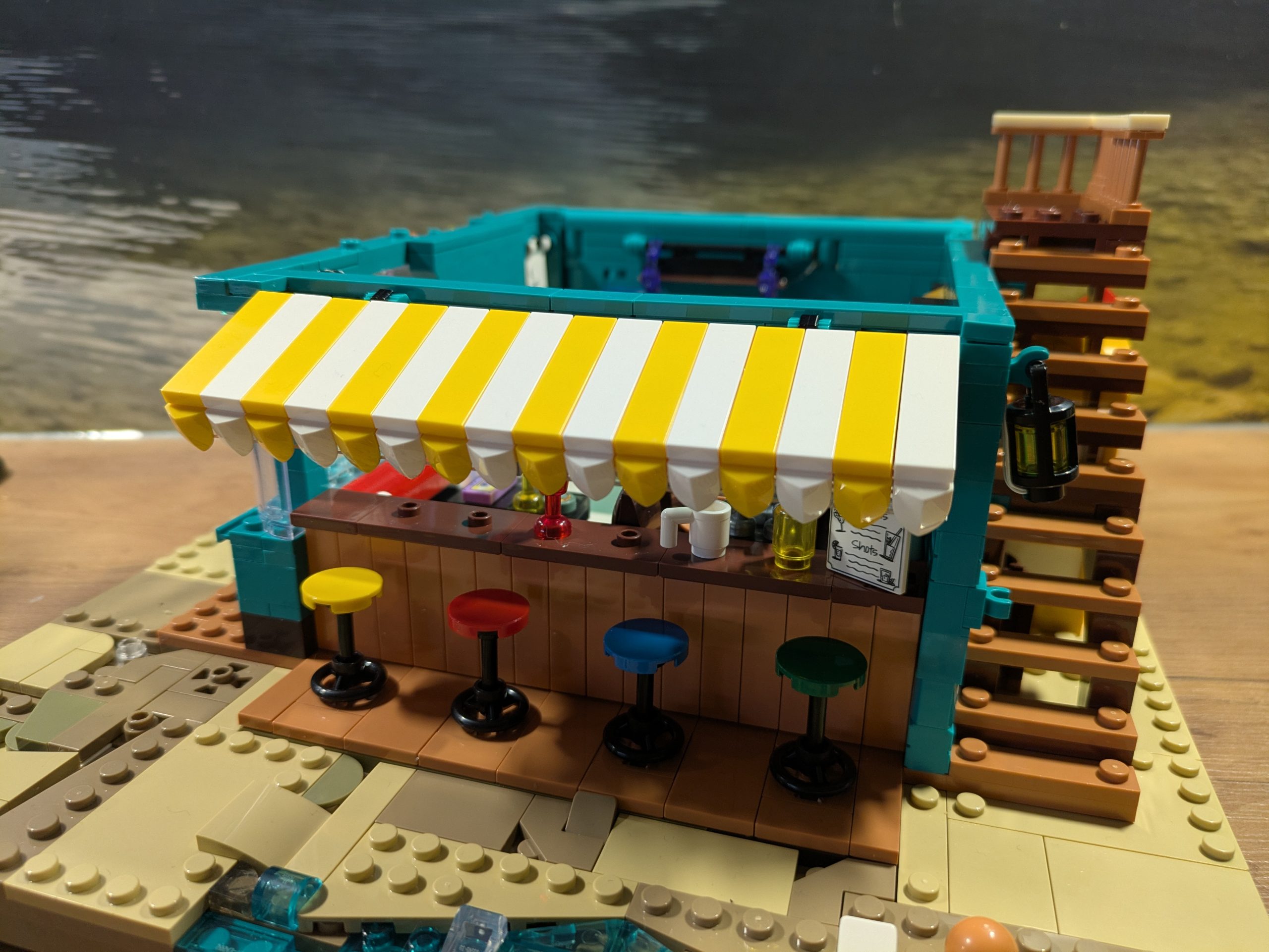 Das Modell stellt eine Strandbar mit Terrasse dar, die direkt an einer Küstenpromenade liegt. Architektur und Farbgebung orientieren sich stark an tropischen Bars oder Surfer-Locations. Typische Elemente des Designs sind eine offene Barfront mit Tresen, eine Dachterrasse oder der Balkonbereich, ein Neon-Bar-Schild und natürlich Strand- oder Küstendekoration und das Set bietet dabei auch wirklich alles. Die Gestaltung erinnert an klassische Strandbars aus Filmen oder Videospielen. Orte, an denen man sich nach einem Tag am Meer trifft. Besonders auffällig ist das große „Moon Bar“-Schild, das aus Klemmbausteinen konstruiert ist und durch Beleuchtung hervorgehoben wird. Dieses Schild ist gleichzeitig ein prägendes Element des gesamten Gebäudes.