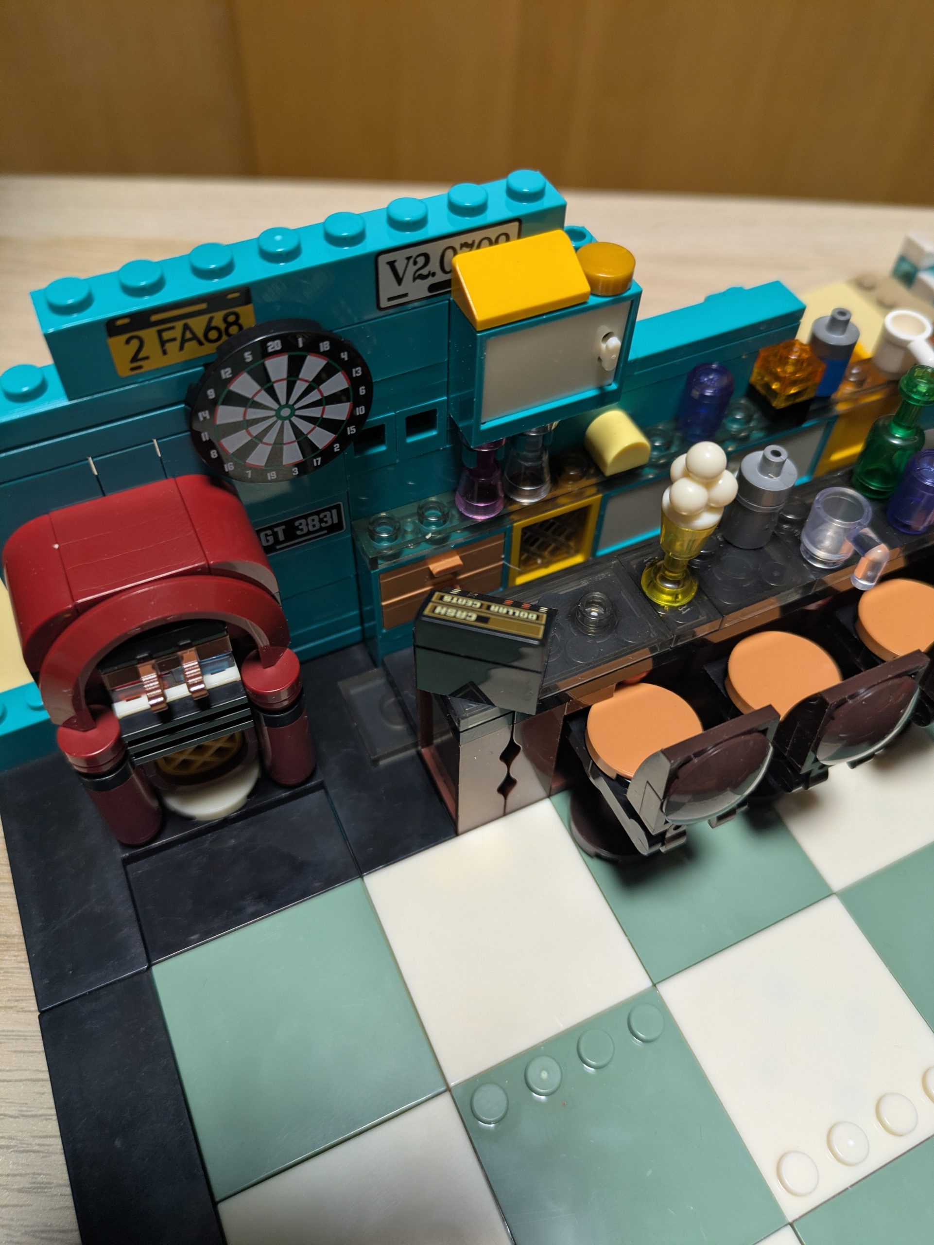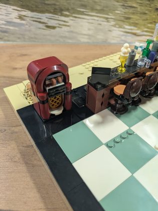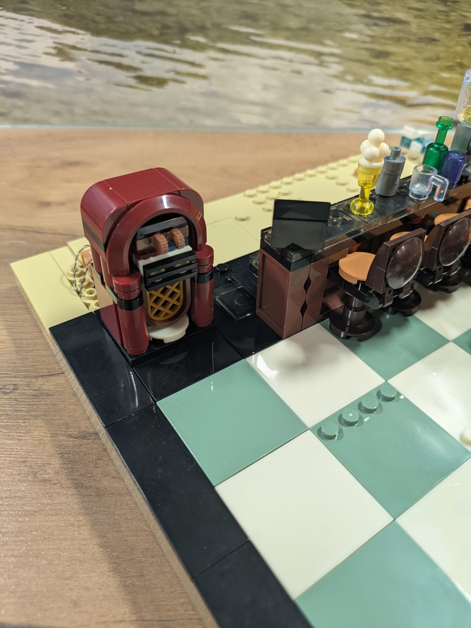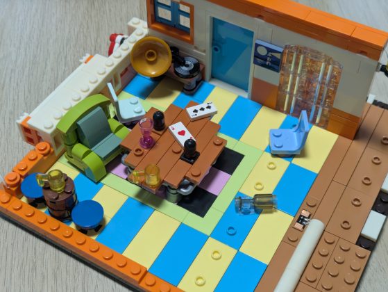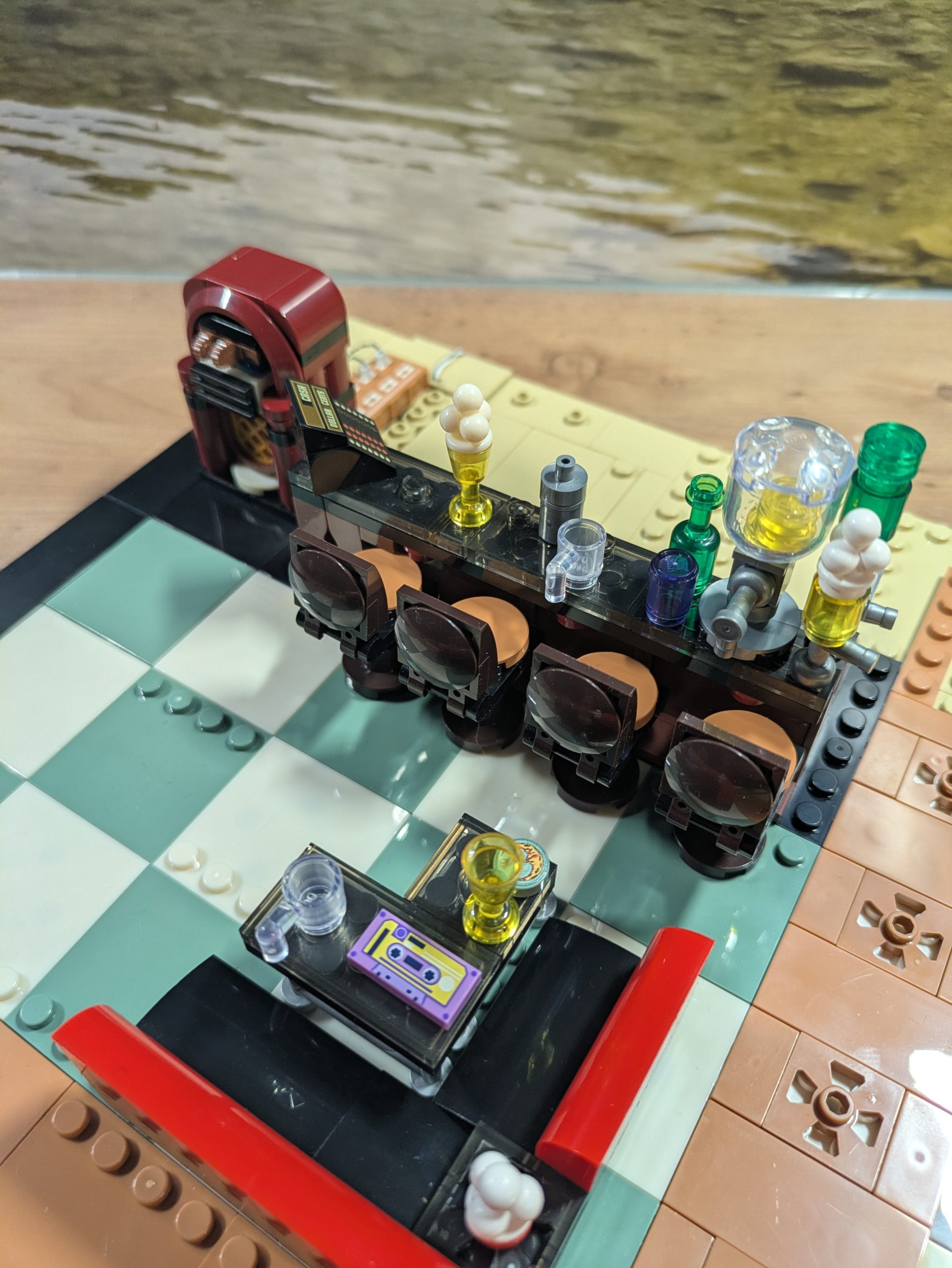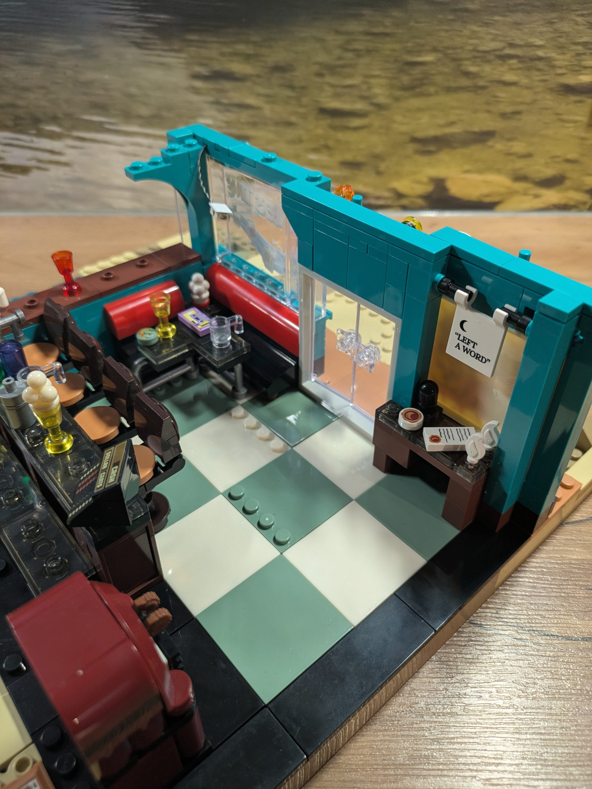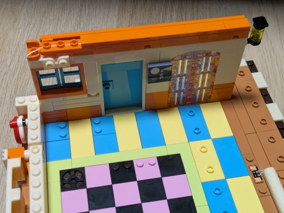 Das Modell stellt eine Strandbar mit Terrasse dar, die direkt an einer Küstenpromenade liegt. Architektur und Farbgebung orientieren sich stark an tropischen Bars oder Surfer-Locations. Typische Elemente des Designs sind eine offene Barfront mit Tresen, eine Dachterrasse oder der Balkonbereich, ein Neon-Bar-Schild und natürlich Strand- oder Küstendekoration und das Set bietet dabei auch wirklich alles. Die Gestaltung erinnert an klassische Strandbars aus Filmen oder Videospielen. Orte, an denen man sich nach einem Tag am Meer trifft. Besonders auffällig ist das große „Moon Bar“-Schild, das aus Klemmbausteinen konstruiert ist und durch Beleuchtung hervorgehoben wird. Dieses Schild ist gleichzeitig ein prägendes Element des gesamten Gebäudes.