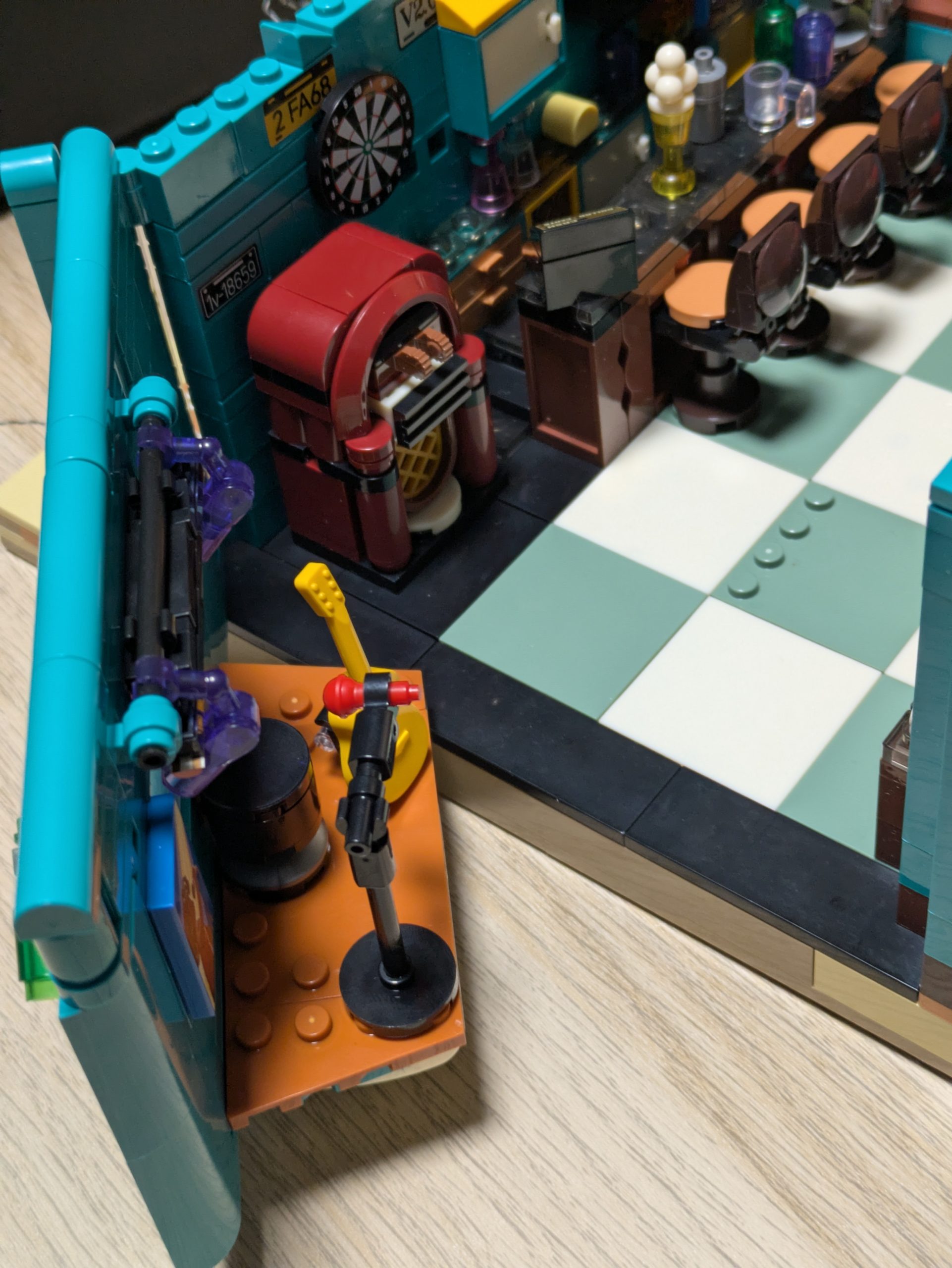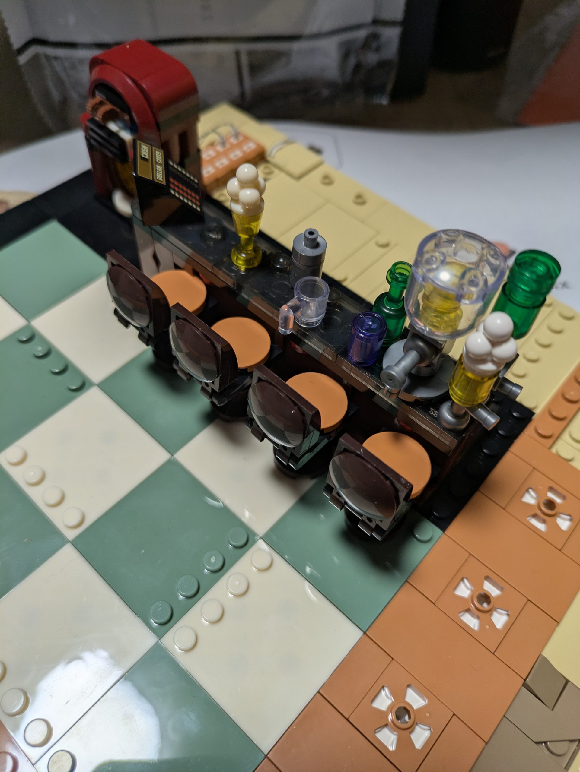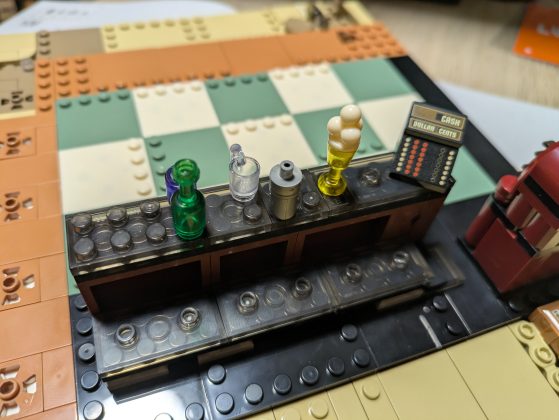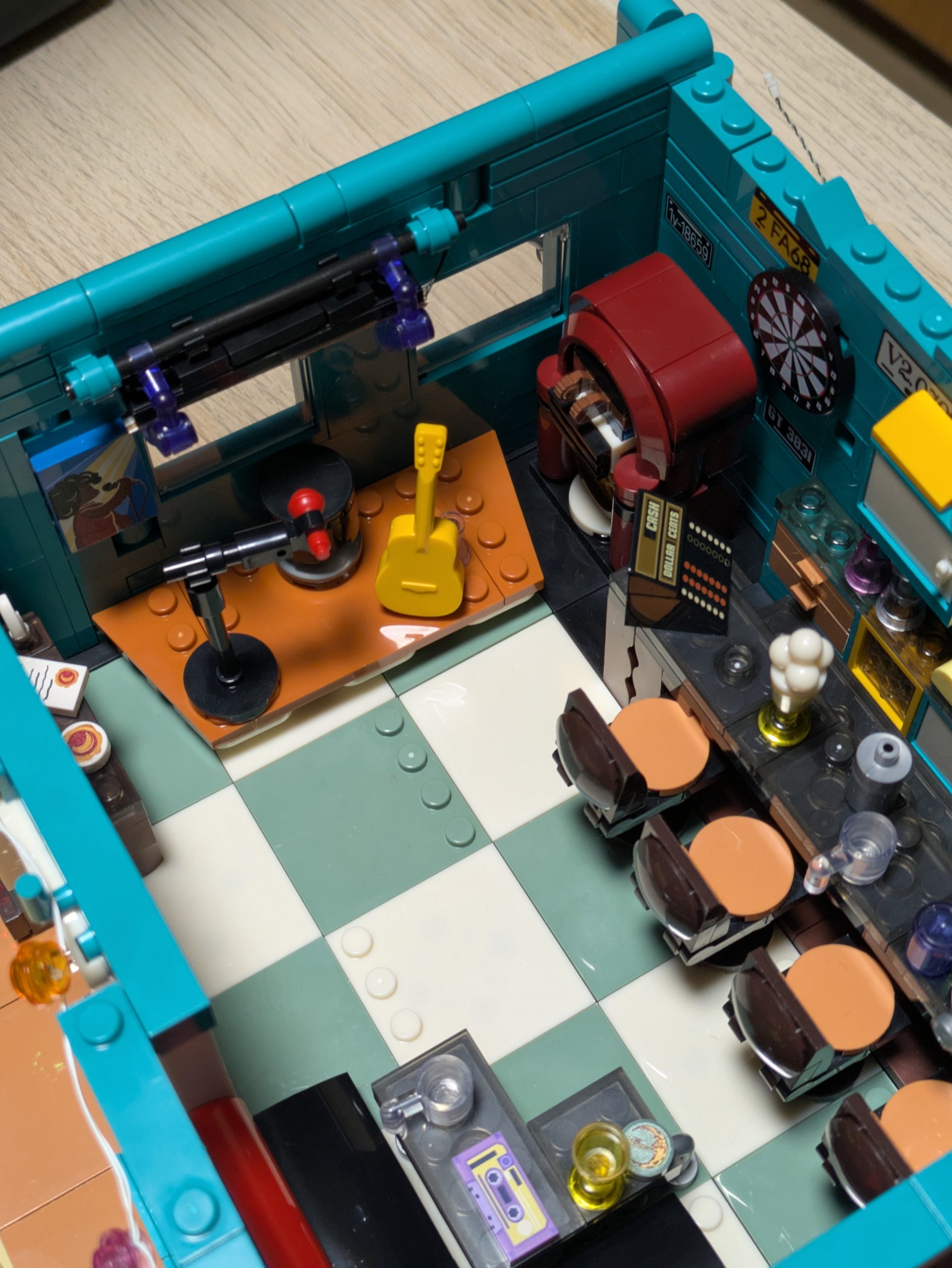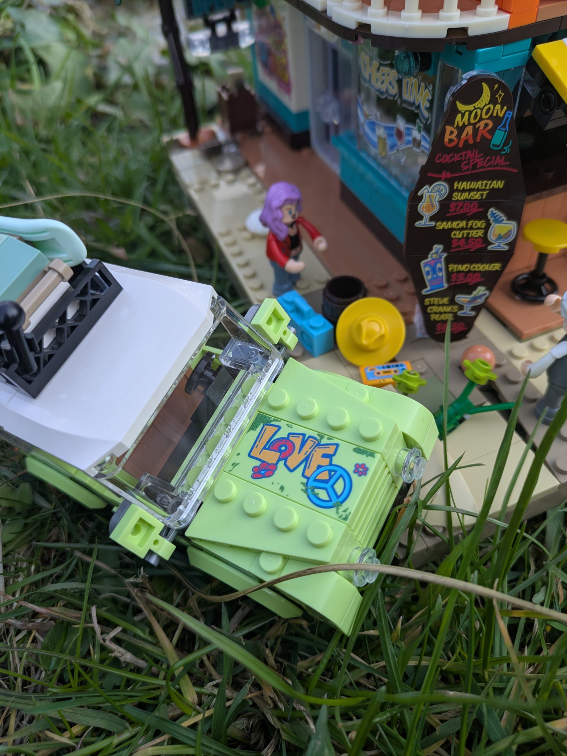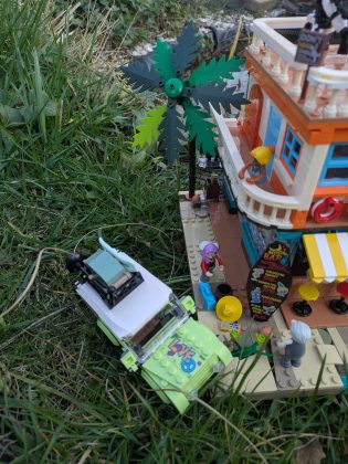 Das Modell stellt eine Strandbar mit Terrasse dar, die direkt an einer Küstenpromenade liegt. Architektur und Farbgebung orientieren sich stark an tropischen Bars oder Surfer-Locations. Typische Elemente des Designs sind eine offene Barfront mit Tresen, eine Dachterrasse oder der Balkonbereich, ein Neon-Bar-Schild und natürlich Strand- oder Küstendekoration und das Set bietet dabei auch wirklich alles. Die Gestaltung erinnert an klassische Strandbars aus Filmen oder Videospielen. Orte, an denen man sich nach einem Tag am Meer trifft. Besonders auffällig ist das große „Moon Bar“-Schild, das aus Klemmbausteinen konstruiert ist und durch Beleuchtung hervorgehoben wird. Dieses Schild ist gleichzeitig ein prägendes Element des gesamten Gebäudes.