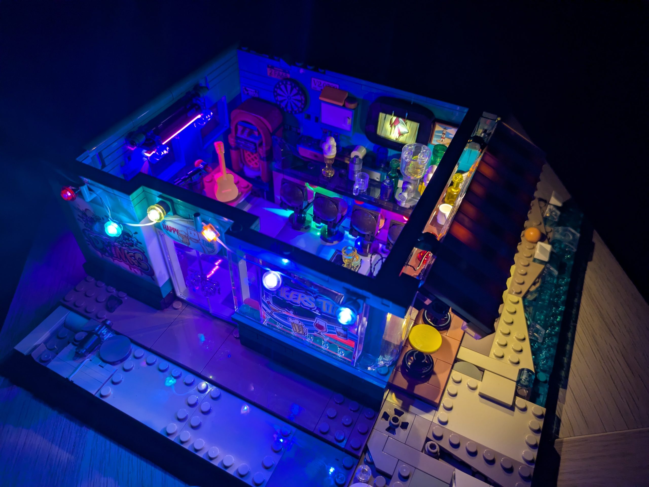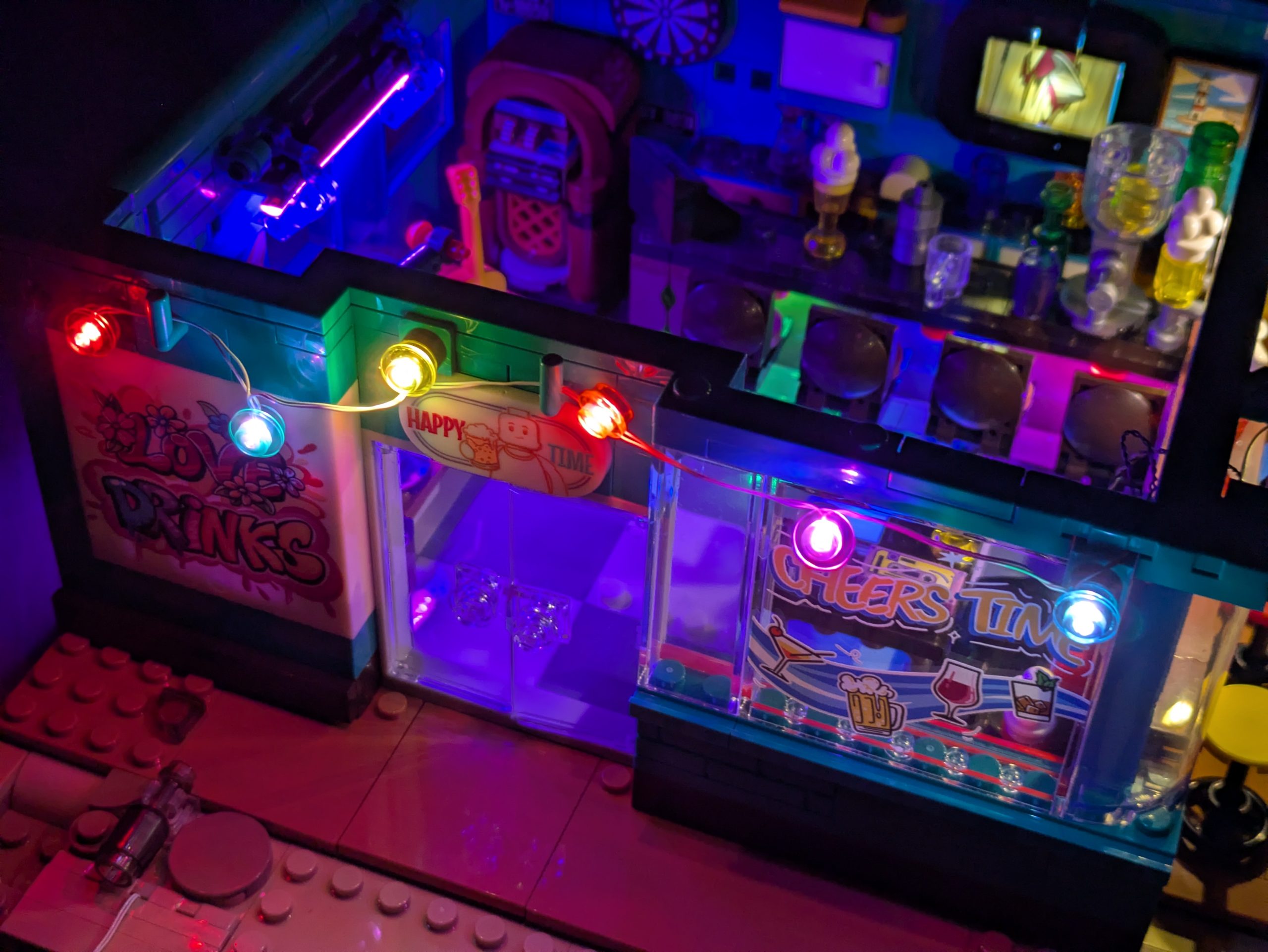 Im Dunkeln entsteht dadurch ein Effekt, der stark an Cyberpunk- oder Strand-Nightlife-Szenen erinnert. Genau dieses Konzept hat Lumibricks in vielen seiner Sets perfektioniert. Der Einbau der LEDs erfolgt während des Bauprozesses. Kabel werden dabei meist unsichtbar zwischen Platten oder in Hohlräumen geführt.