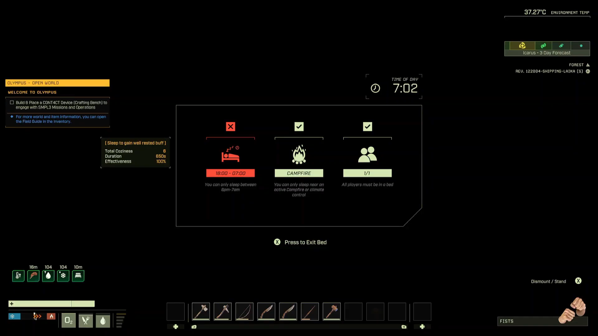 Das Herzstück von ICARUS ist sein einzigartiges Missionssystem. Anders als viele andere Survival-Spiele nutzt das Spiel keine dauerhaft bestehende Welt. Stattdessen beginnt jede Mission mit einem Drop. Spieler werden mit minimaler Ausrüstung auf den Planeten abgesetzt und müssen dort Ressourcen sammeln, Werkzeuge herstellen, Schutz bauen und ihre Missionsziele erfüllen. Der entscheidende Unterschied liegt im Zeitlimit. Jede Mission läuft nur für eine bestimmte Dauer. Wer nicht rechtzeitig zur Evakuierung zurückkehrt, riskiert den Verlust seines Charakters. Diese Mechanik sorgt für ein ständiges Gefühl von Zeitdruck. Während viele Survival-Spiele gemütliches Basisbauen ermöglichen, zwingt ICARUS Spieler dazu, Entscheidungen sorgfältig abzuwägen. Zu viel Zeit mit Erkundung oder dem Ausbau einer perfekten Basis zu verbringen, kann am Ende dazu führen, dass der Rettungsflug verpasst wird.