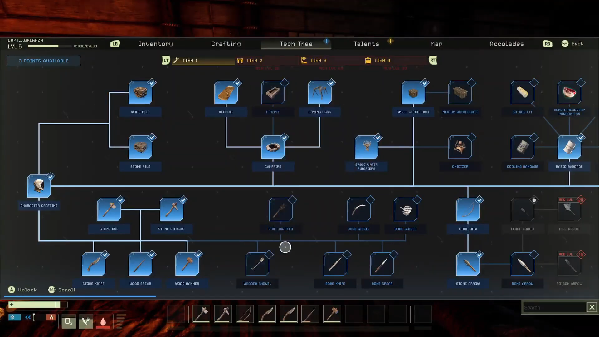 Wie viele Survival-Spiele basiert auch ICARUS stark auf Crafting und technologischem Fortschritt. Zu Beginn verfügen Spieler lediglich über primitive Werkzeuge aus Holz und Stein. Im Verlauf der Missionen lassen sich jedoch immer komplexere Technologien freischalten. Das Crafting-System ist in mehrere Technologiestufen unterteilt. Mit fortschreitendem Spielverlauf können Spieler unter anderem folgende Systeme entwickeln: Elektrische Stromversorgung, Fortgeschrittene Raumanzüge, Industrielle Maschinen und Spezialisierte Umweltwerkzeuge. Diese Entwicklung von primitiven Überlebensmethoden hin zu moderner Technologie unterstreicht den Science-Fiction-Aspekt des Spiels.