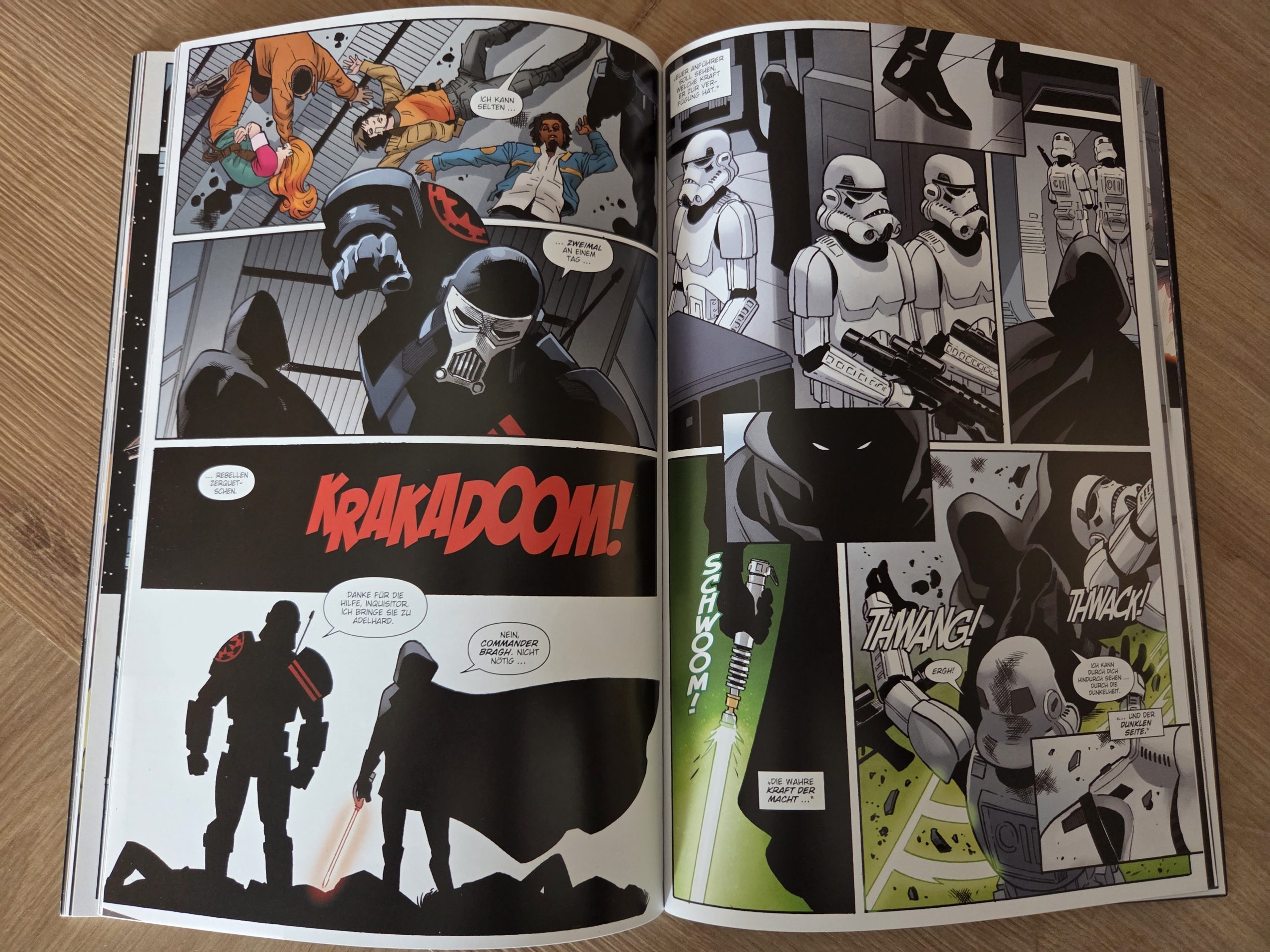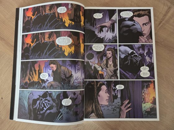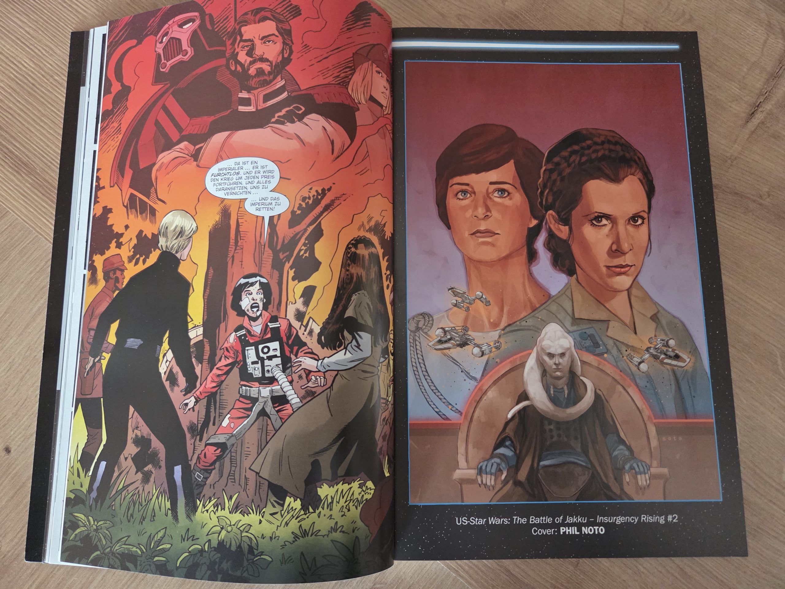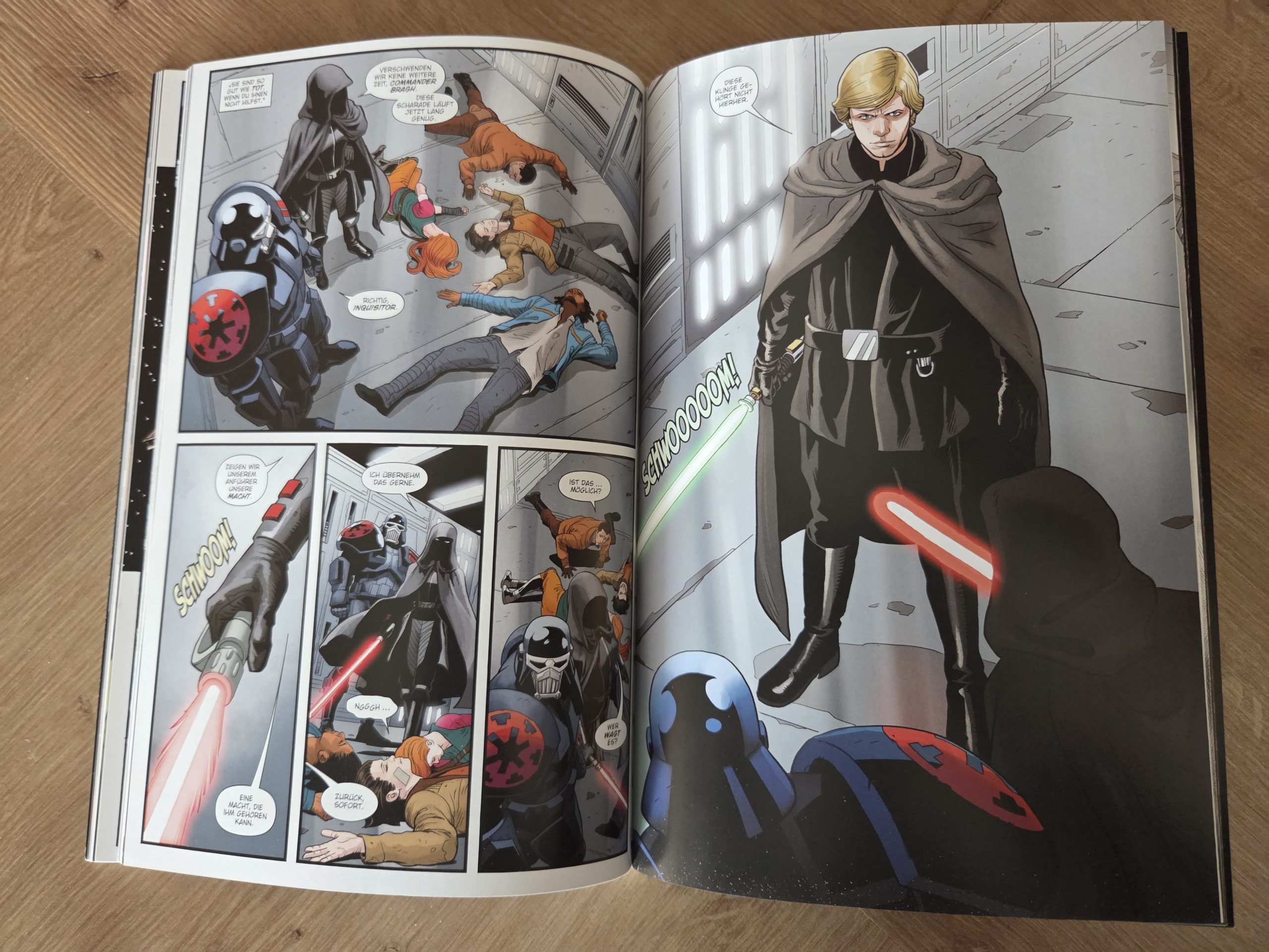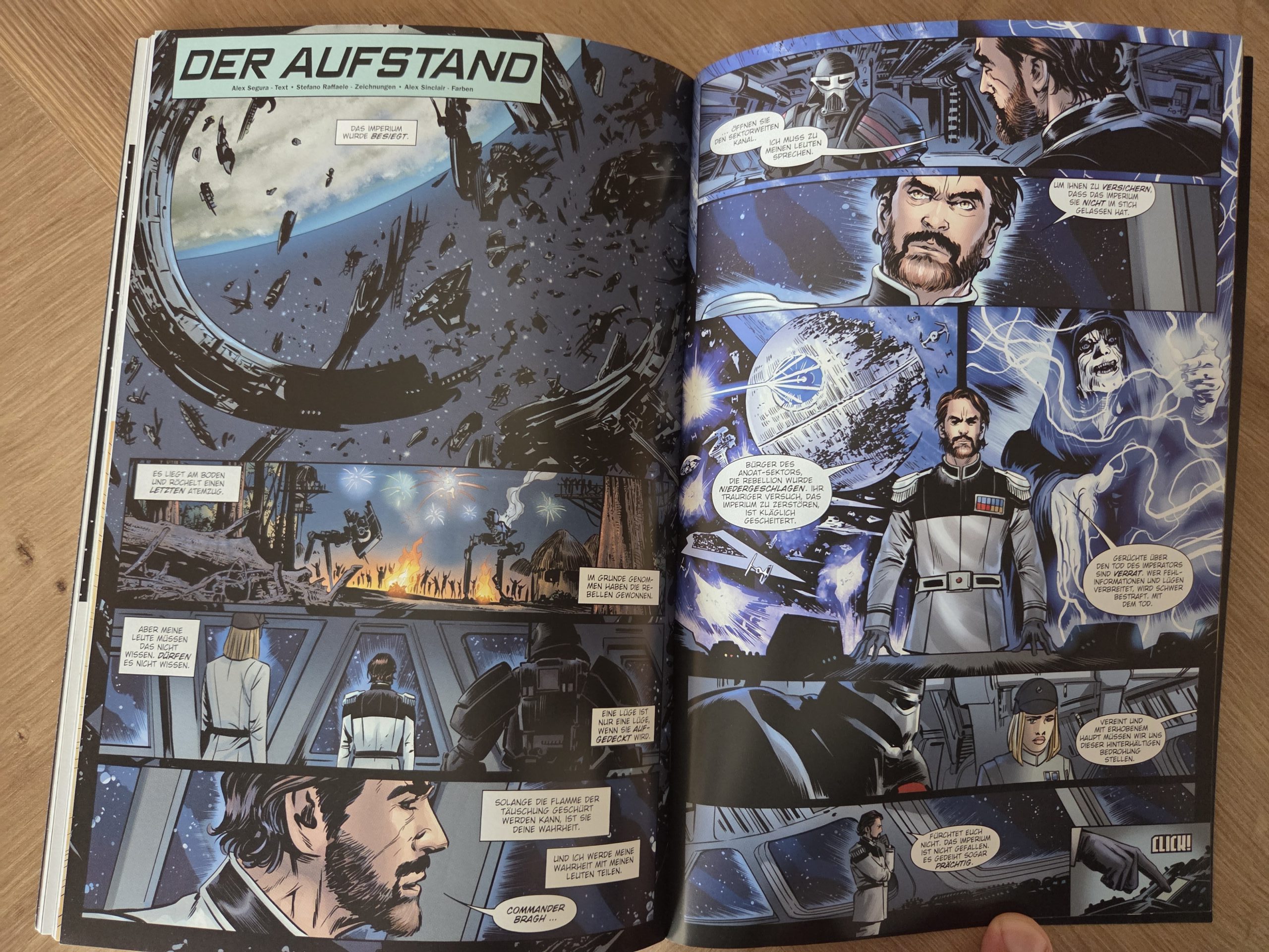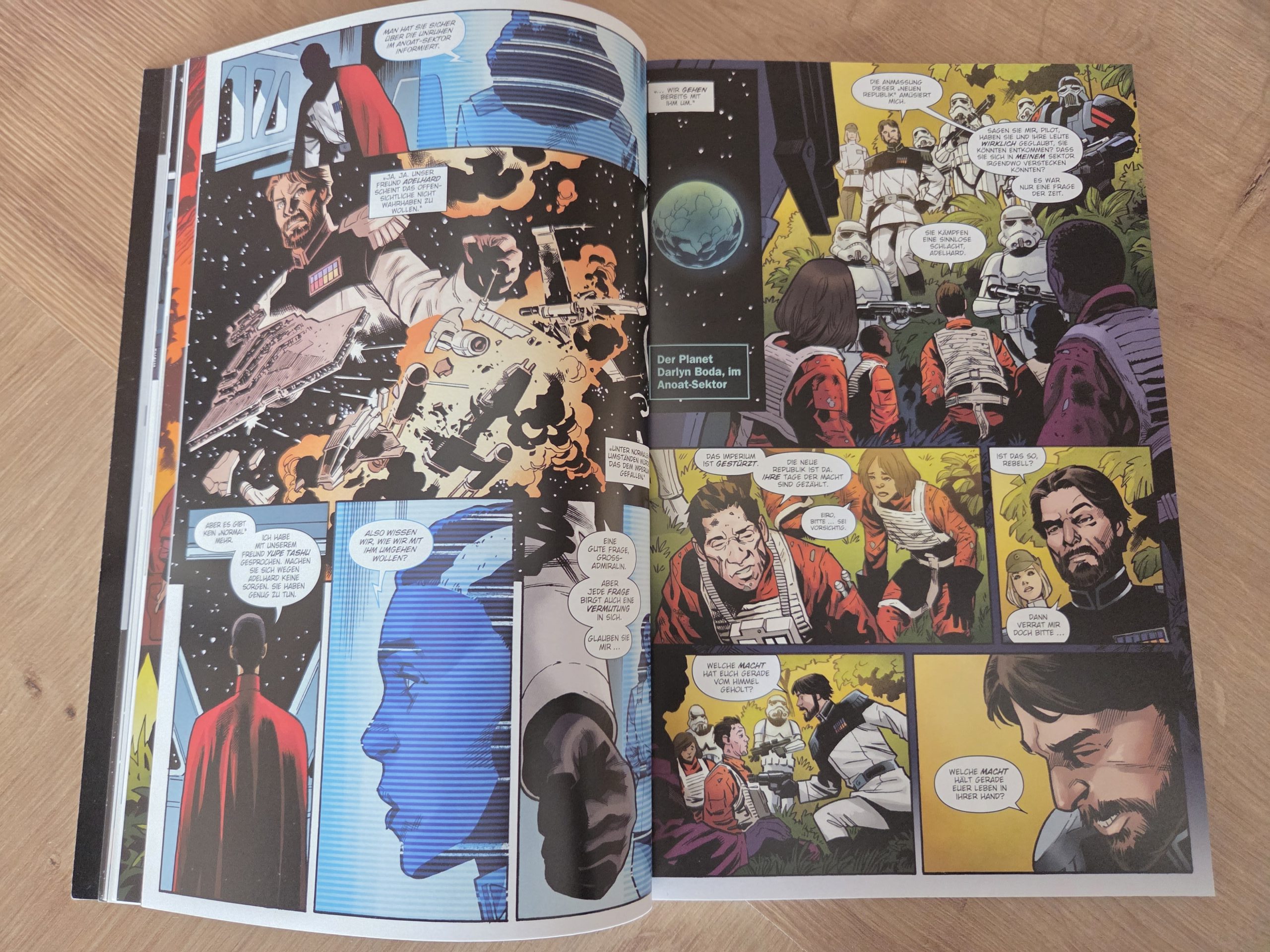 Hinzu kommt, dass die Story entweder zu generisch oder schlicht zu wenig einprägsam bleibt. So sehr, dass ich sie nach kurzer Zeit kaum noch rekonstruieren konnte. Dass ich einen Comic für eine Rezension nach nur einem Monat praktisch komplett neu lesen muss, ist eher die Ausnahme als die Regel. Gerade die Vielzahl an Figuren, die Segura parallel über die „galaktische Landkarte“ bewegt, verhindert eine echte Bindung zu einzelnen Charakteren. Am Ende bleibt vor allem Verwunderung darüber, wie Luke Skywalker beinahe wie ein Deus ex Machina auftaucht, um die Gefangenen zu retten und die Imperialen bloßzustellen. Gewonnen ist damit zwar eine Schlacht, doch wie Luke selbst anmerkt, längst nicht der Krieg. Deutlich positiver fällt hingegen der visuelle Aspekt aus. Die Zeichnungen wissen insgesamt zu überzeugen: Bekannte Figuren aus Filmen und Comics sind sofort wiederzuerkennen, ebenso Charaktere aus Freier Fall. Besonders Ubrik Adelhard sticht mit seinem markanten Design hervor, während Bragh in seiner Rüstung und Alaytia mit ihrer Mischung aus Unsicherheit und Entschlossenheit ebenfalls gelungen umgesetzt sind. Reyna Oskure schließlich trägt ihren inneren Wahnsinn förmlich im Gesicht. Die Qualität der Hintergründe schwankt je nach Zeichner, doch insbesondere der One-Shot Der Aufstand hebt sich hier deutlich ab, sowohl zeichnerisch als auch farblich ein echtes Highlight des Bandes.